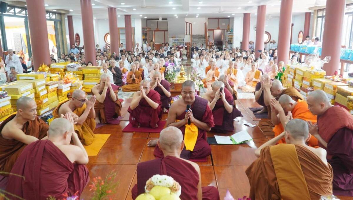 Đại đức Pháp Hảo và Đại đức Chánh Niệm đọc tụng Tuyên ngôn giao y Kathina cho Đại đức Thiện Ý (Manokusala) thọ y Kathina.