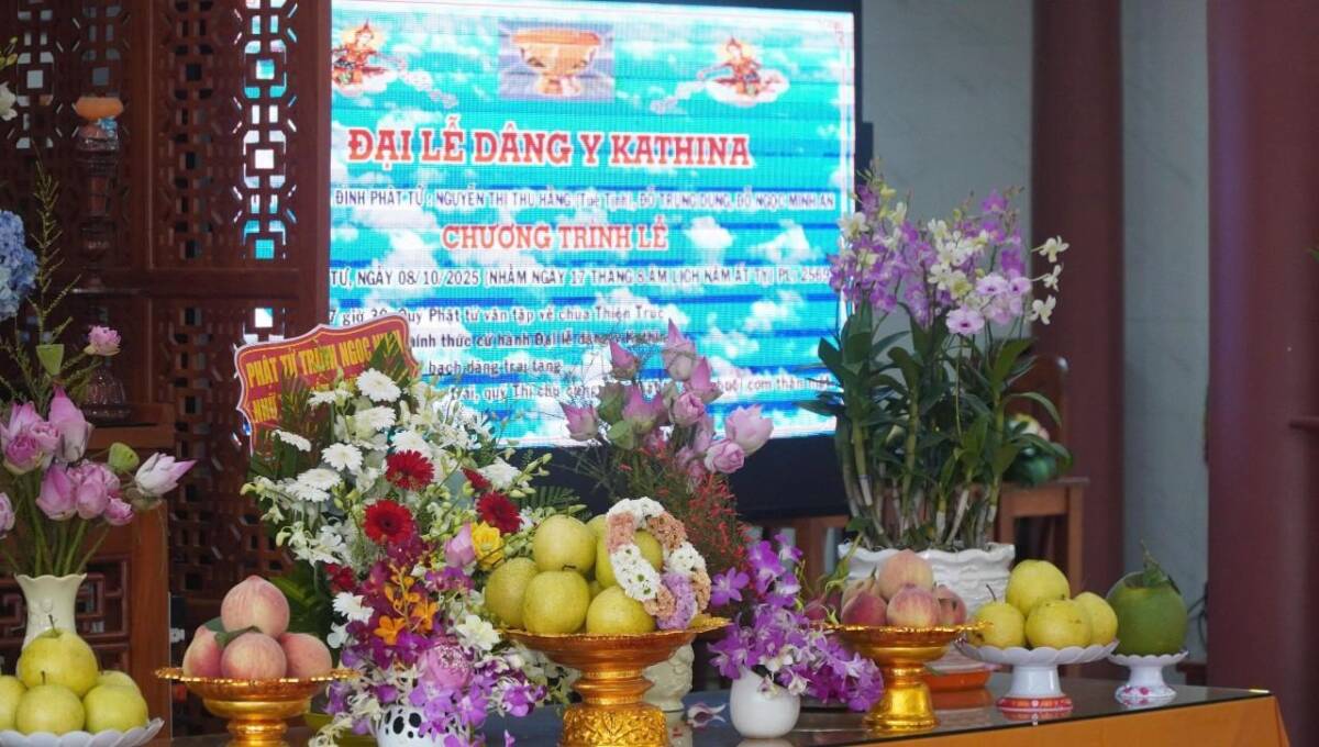 Để tỏ lòng thành kính đấng phụ Gotama, trước khi thực hiện lễ chư Phật tử nhiễu Phật ba vòng quanh chánh điện và sau đó thí chủ dâng hương và đọc tác bạch dâng y Kathina sau đó. Sau lễ thọ y của chư Tăng là niềm hoan hỷ của tất cả quần chúng tín đồ tham dự lễ, sau dự bữa cơm thân mật và hoàn mãn chương trình.