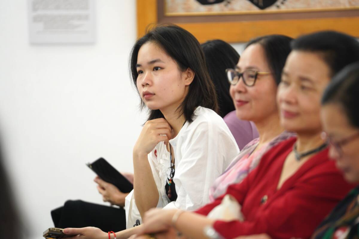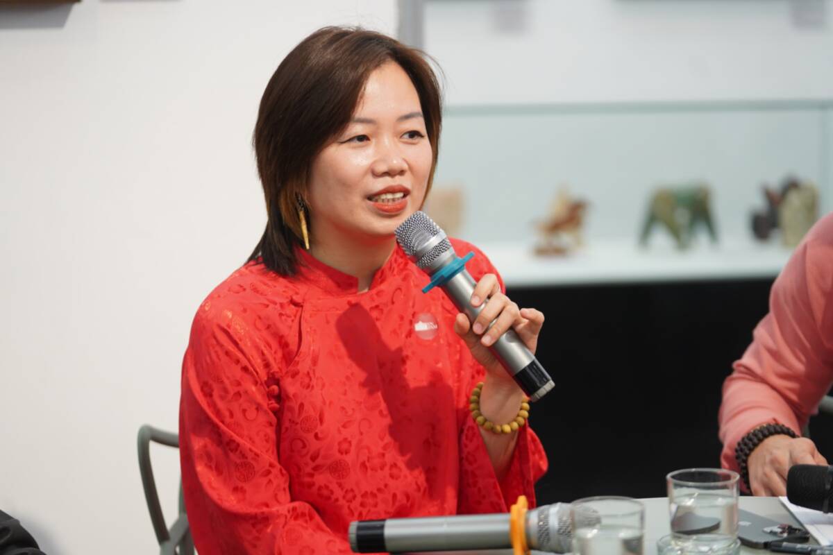 Nhưng sen trong tranh của Bình Nhi không dừng lại ở vẻ đẹp thiên nhiên; đó là “sự sống hiện tại và sức sống trong tâm thức”. Chị khéo léo đưa những hoa văn điêu khắc cổ xưa thuần Việt, những nét chạm trổ từ các ngôi chùa Việt lên tranh, lên gốm và cả những tà áo dài truyền thống, hay những bức Thangka mang ý nghĩa Tâm Linh Phật giáo Việt Nam . Với Bình Nhi, mỗi tác phẩm là một lời nguyện cầu cho sự bình an, là nỗ lực gìn giữ “hồn phách” văn hóa dân tộc để chúng không bị mai một trước dòng chảy thời gian. Sự khiêm nhường của một người nghệ sĩ đang trên con đường tu tập tại Nepal càng làm cho những chia sẻ của chị thêm phần sâu lắng và chạm tới trái tim người nghe.