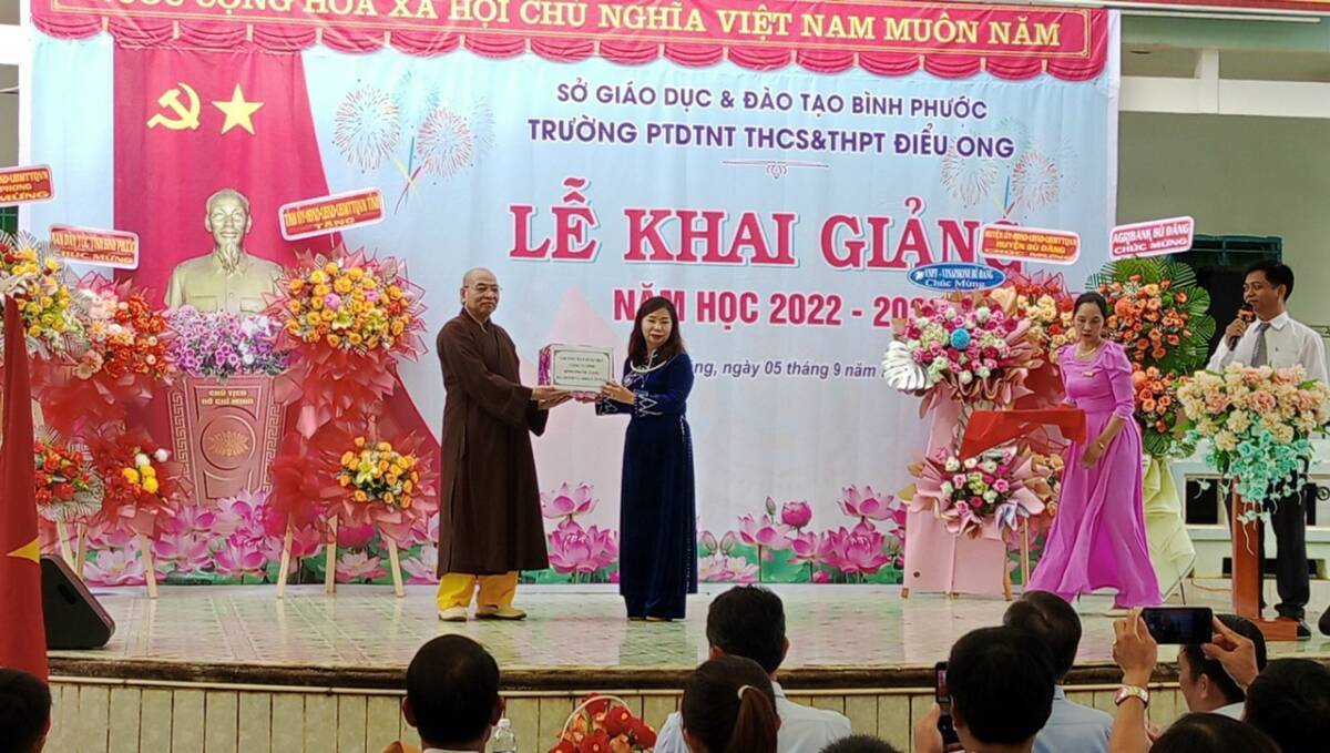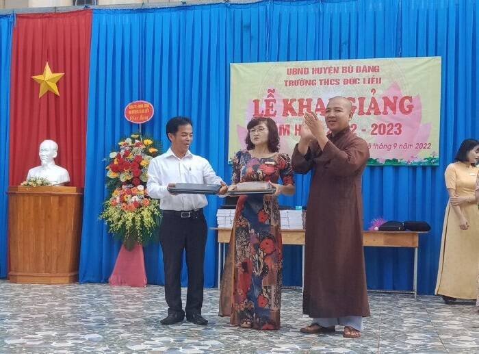 PGĐSO- Hòa trong không khí hân hoan ngày Khai giảng năm học mới 2022-2023 của học sinh cả nước, nhằm đồng hành cùng xã hội trong công tác giáo dục, sáng ngày 05/9/2022, Thượng tọa Thích Đồng Tấn, Phó Ban Trị sự kiêm Trưởng Ban Giáo dục Phật giáo tỉnh Bình Phước, Trưởng Ban Trị sự Phật giáo huyện Bù Đăng, cùng chư Tôn đức Ban Trị sự Phật giáo huyện, đã trao 50 laptop và 5000 quyển tập với tổng trị giá 125 triệu đồng, cho học sinh đồng bào dân tộc vượt khó học giỏi thuộc các trường Điểu Ong, Đức Liễu, Nguyễn Trường Tộ, Nguyễn Văn Trỗi và Kim Đồng.