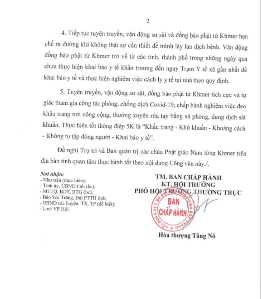 - Tiếp tục tuyên truyền, vận động Sư sãi và đồng bào Phật tử Khmer hạn chế ra đường khi không thực sự cần thiết, để tránh lây lan dịch bệnh. Vận động đồng bào Phật tử Khmer trở về từ các tỉnh, thành phố trong những ngày qua chưa thực hiện khai báo y tế khẩn trương đến ngay Trạm y tế xã gần nhất để khai báo y tế và thực hiện nghiêm việc cách ly y tế tại nhà theo quy định.