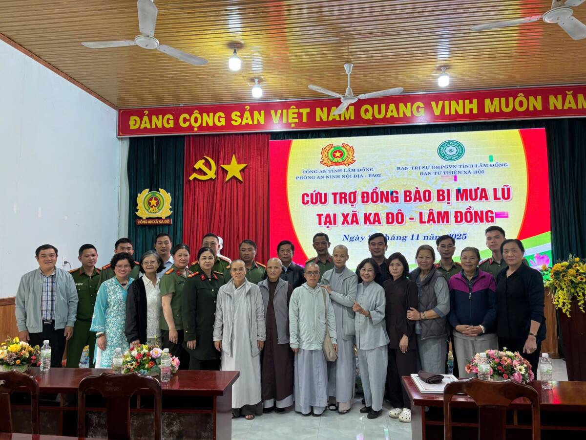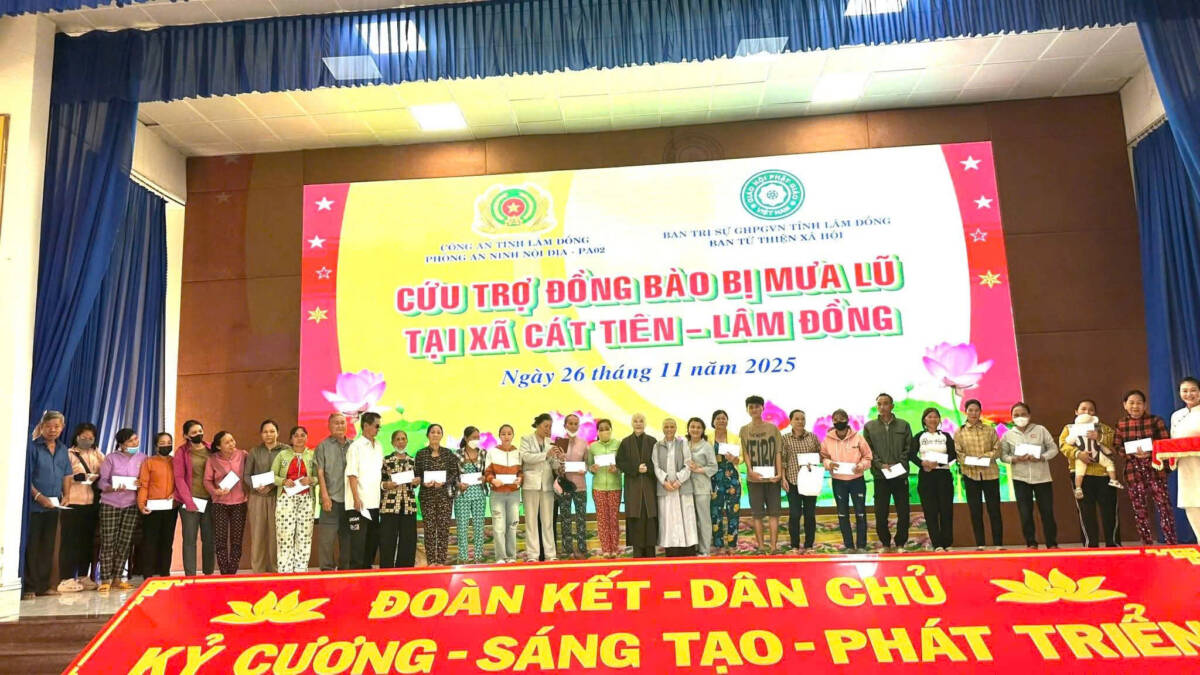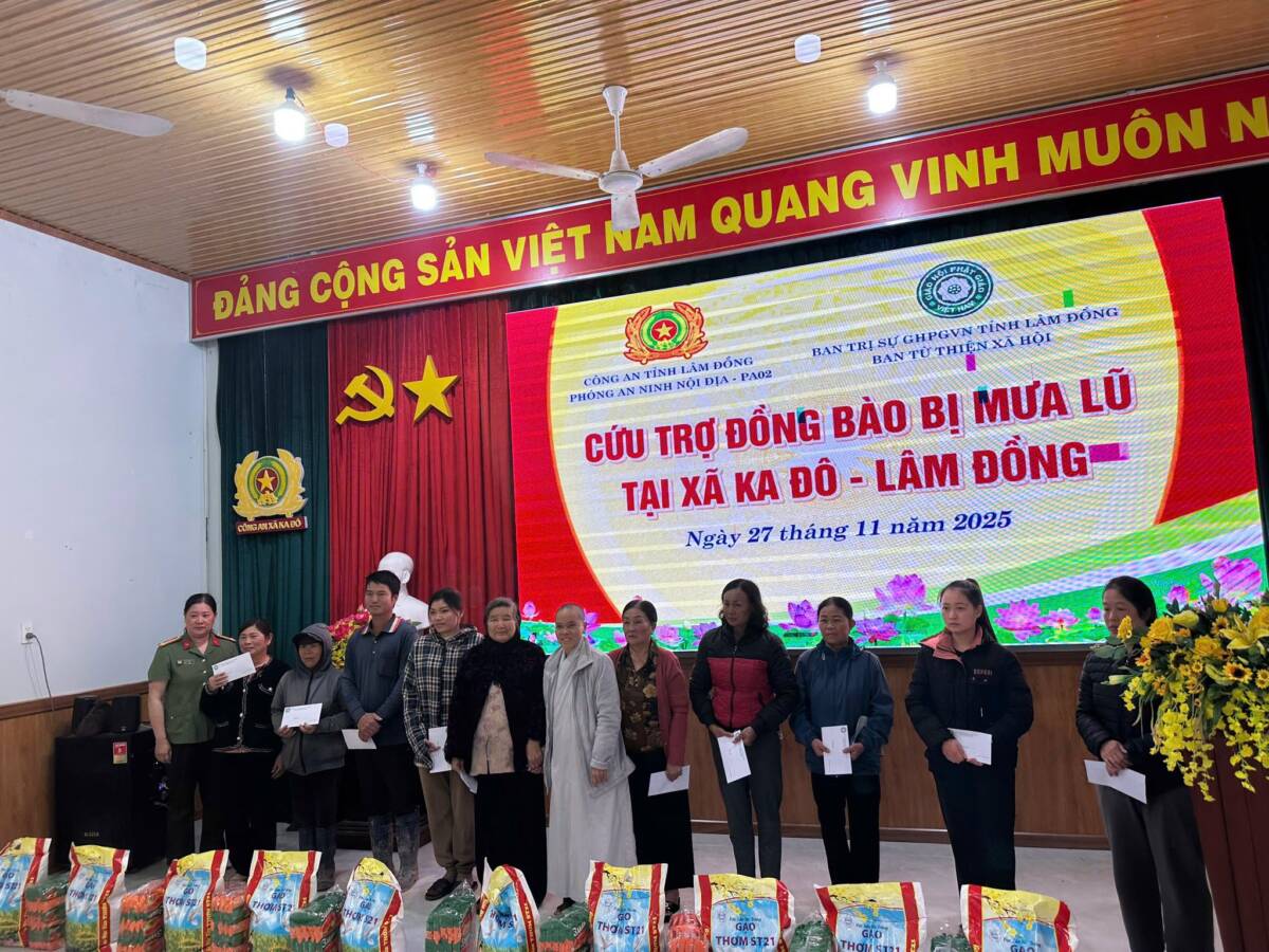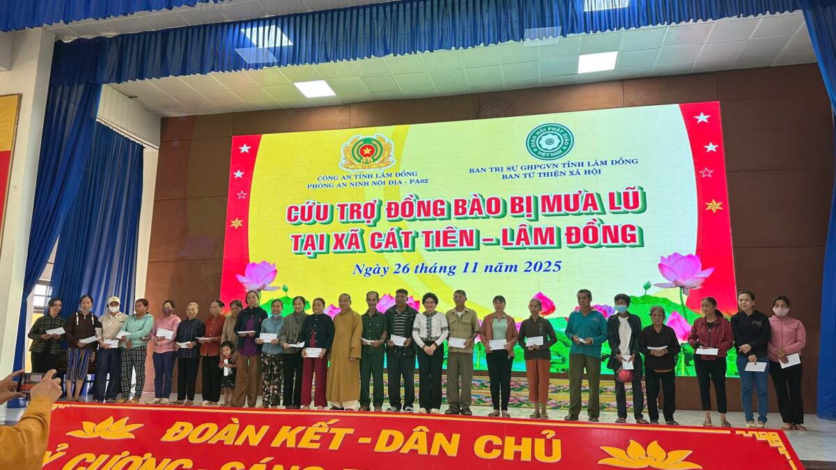 Ngày 26/11/2025, tại xã Cát Tiên, đoàn cứu trợ có sự chứng minh và tham dự của TT. Thích Thanh Nhật – Phó Ban kiêm Chánh Thư ký Ban Trị sự Phật giáo tỉnh, TT. Thích Chiếu Ý – Phó Ban Trị sự kiêm Phó Thường trực Ban TTXH Phật giáo tỉnh; Ni sư Thích Nữ Hạnh Khai, UVTT BTS PG tỉnh, Phó Thường trực Ban TTXH Phật giáo tỉnh, Phó Thư ký PBNG tỉnh, chư Tôn đức cùng quý cư sĩ thành viên ban TTXH PG; Thượng tá Lê Công Duy – Phó trưởng phòng PA02 cùng các cán bộ của phòng.