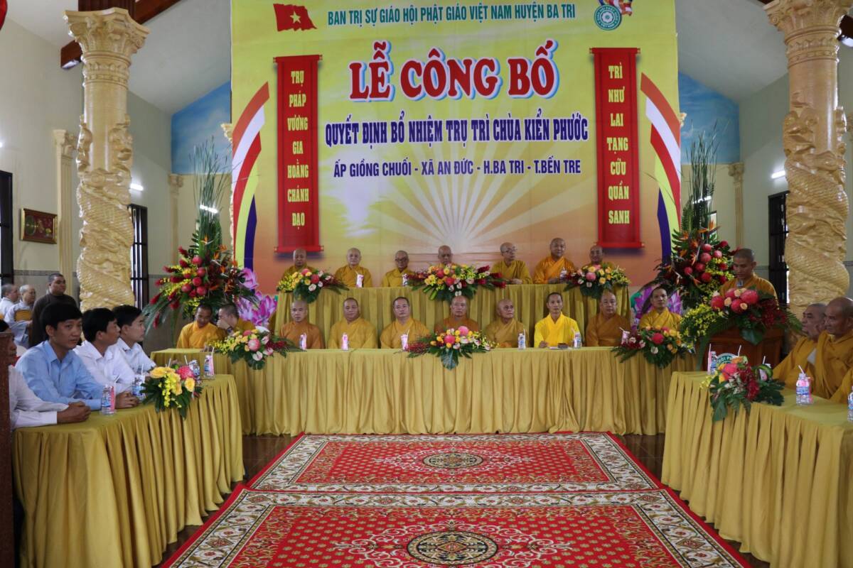 PGĐS – Sáng ngày 04/12/2022 (nhằm ngày 11/11/Nhâm Dần), Ban Trị sự GHPGVN huyện Ba Tri long trọng tổ chức lễ Quyết định bổ nhiệm Sư cô Thích nữ Huệ Nghiêm đảm nhiệm chức vị trụ trì chùa Kiển Phước – ấp Giồng Chuối, xã An Đức, huyện Ba Tri, tỉnh Bến Tre.