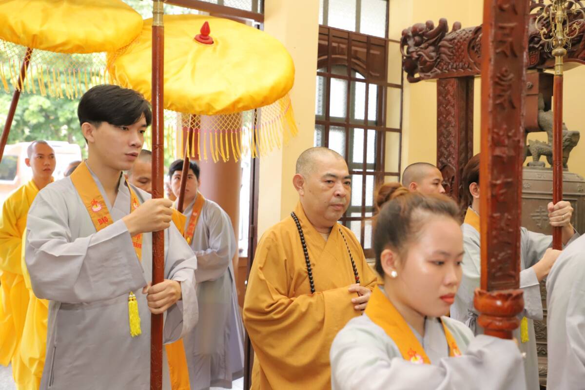 Đúng 10h00, CTĐ cùng quý Phật tử vân tập nơi Phật điện cử hành nghi thức cúng ngọ, sau đó quang lâm nơi trai đường Chứng minh buổi lễ trai tăng Kỳ siêu cửu huyền thất tổ.Qua lời tác bạch của đại diện quý Phật tử ĐĐ.Thích Huệ Minh – Trưởng BHDPT GHPGVN tỉnh Bình Dương đã đãi lao cho CTĐ ca ngợi tán thán nghĩa cử cao đẹp, tinh thần hiếu đạo của người con Phật. Đại Đức nhấn mạnh “Sống trên đời là cả một sự hàm ơn. Dù là ai, hoàn cảnh và điều kiện thế nào, chúng ta đều mang ơn trực tiếp hoặc gián tiếp với người, phải chịu ơn xa hoặc gần với đời. Người học Phật luôn tự nhắc mình về bốn ơn sâu nặng (ơn cha mẹ, ơn Tam bảo, ơn quốc gia, ơn tín thí) để lo báo đền.”