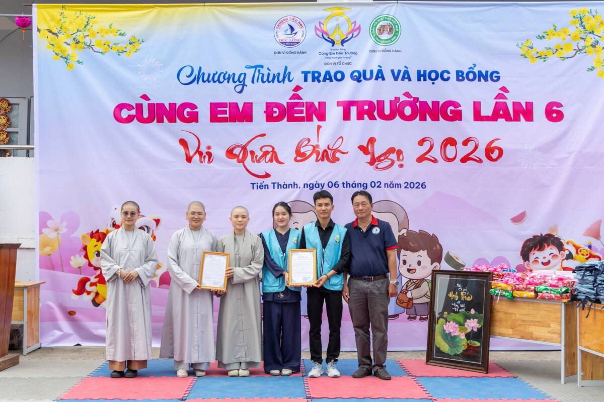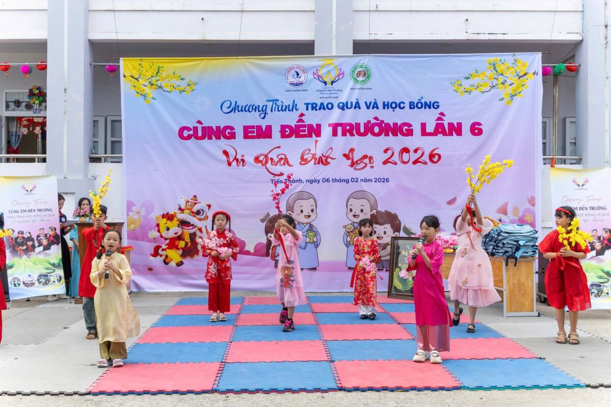 Ngày 05/02/2026, chương trình trao quà và học bổng đã chính thức diễn ra trong không khí trang nghiêm, ấm áp và đầy xúc động, với sự hiện diện của: Sư cô Thích Nữ Tường Chơn – Chủ nhiệm Quỹ học bổng; Thầy Giác Minh Phong; Đại diện chính quyền địa phương; Quý thầy cô giáo; Quý nhà hảo tâm, mạnh thường quân