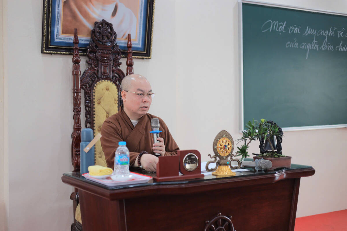 Hoan hỉ Nhận lời mời của chư tôn đức khối Văn phòng lớp Cao cấp giảng sư. TT. Thích Đức Lợi phó Ban hoằng pháp TW GHPGVN không chỉ tận tâm trao truyền những kiến thức kỷ năng dẫn chương trình phật giáo trong thời đại mới mà còn là hành trình gieo trồng hạt giống chính niệm qua từng lời nói, từng hơi thở của người làm công tác hoằng pháp. Các buổi học được tổ chức với mục đích nâng cao năng lực dẫn dắt các buổi lễ, sự kiện Phật giáo, giúp người dẫn chương trình không chỉ vững vàng về kỹ thuật mà còn thấm nhuần tinh thần Phật pháp. Người dẫn chương trình không đơn thuần là người “nói”, mà là chiếc cầu nối giữa đạo và đời, giữa hình thức nghi lễ và chiều sâu tâm linh. Trong suốt thời gian diễn ra khóa học, học viên đã được hướng dẫn chi tiết từ cách xây dựng kịch bản, xử lý tình huống, điều tiết cảm xúc, đến nghệ thuật sử dụng ngôn từ mang đậm chất thiền vị. Đặc biệt, điểm nhấn của chương trình chính là việc lồng ghép giáo lý vào từng lời dẫn, để mỗi câu nói đều trở thành một đóa hoa pháp, nhẹ nhàng đi vào lòng người.