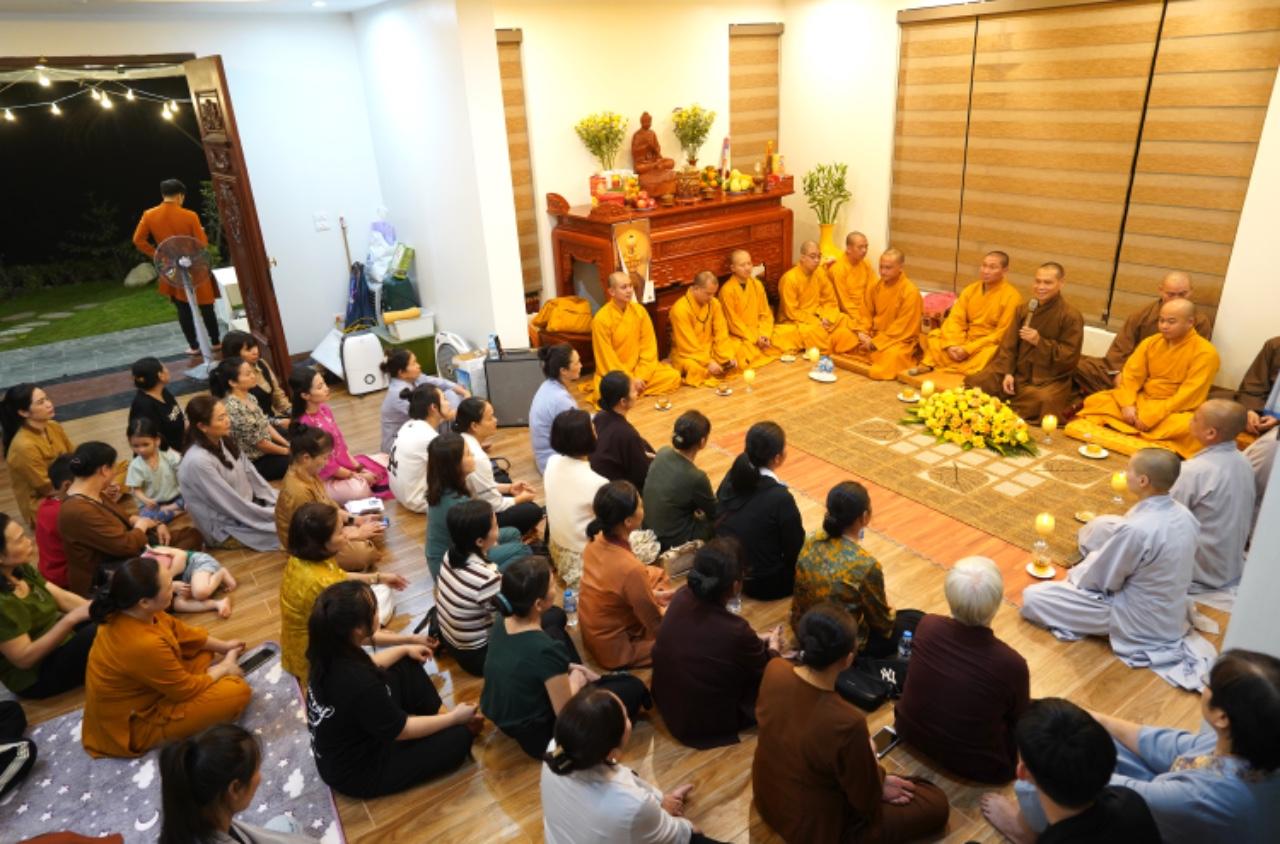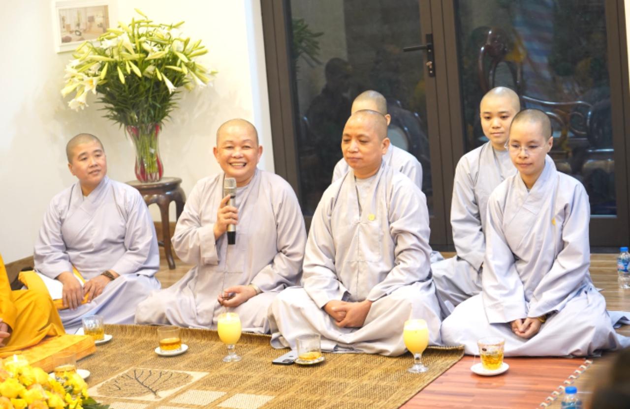 Trong không gian ấm áp, Thượng tọa Trí Chơn đã giới thiệu các thành viên trong đoàn và thỉnh mời quý Tôn đức Tăng Ni chia sẻ đôi lời huấn từ đến hơn 30 quý Phật tử Ninh Hiệp và các địa phương lân cận trở về tham dự. Trong thời Pháp thoại, Thượng tọa chia sẻ về những phương pháp tịnh hóa thân tâm qua lời Phật dạy. Ngài nhấn mạnh trước hết, quý Phật tử cần nương tựa nơi Ba ngôi báu Phật, Pháp, Tăng và thực hành theo đúng lời Phật dạy để vườn tâm được dọn rác mỗi ngày mới có thể trở nên tươi đẹp và thanh tịnh.