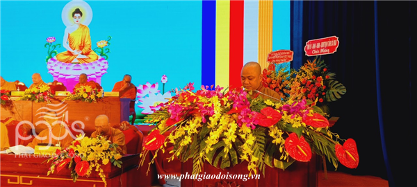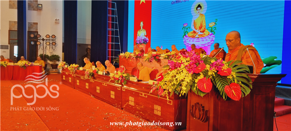 ĐĐ Thích Phước Hạnh báo cáo tổng kết công tác Phật sự nhiệm kỳ VII (2017-2022), đồng thời Thông qua các dự thảo và trình bày phương hướng hoạt động Phật sự nhiệm kỳ VIII (2022 – 2027) của Ban Trị Sự GHPGVN tỉnh Cà Mau.