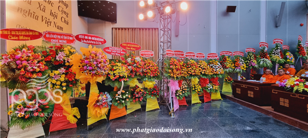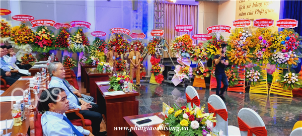 Tại đây,Ban tổ chức Đại hội nhận được nhiều lẳng hoa tươi thắm và những phần quà chúc mừng từ chư Tôn đức HĐTS, BTS các tỉnh thành bạn và lãnh đạo các cấp Chính quyền.
