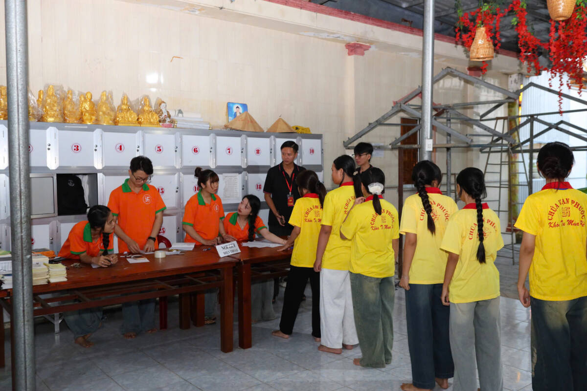 Ngay từ sớm, hơn 300 thanh thiếu niên Phật tử từ nhiều nơi đã trở về chùa dùng điểm tâm, nhận đồng phục và được chia thành nhiều nhóm để thuận tiện cho việc sinh hoạt.