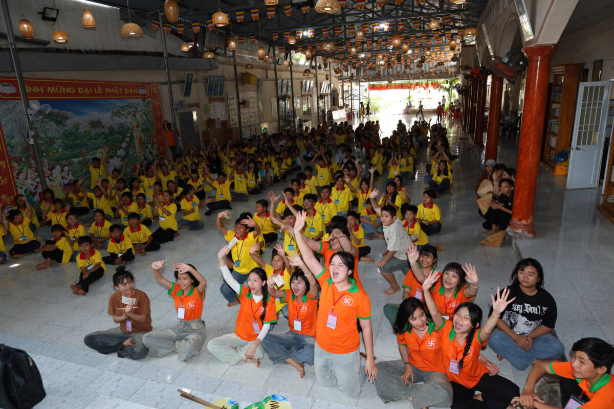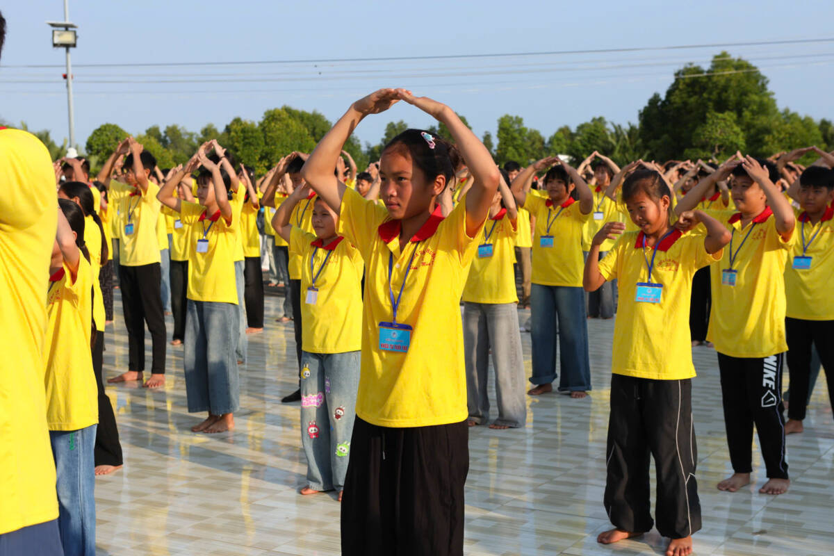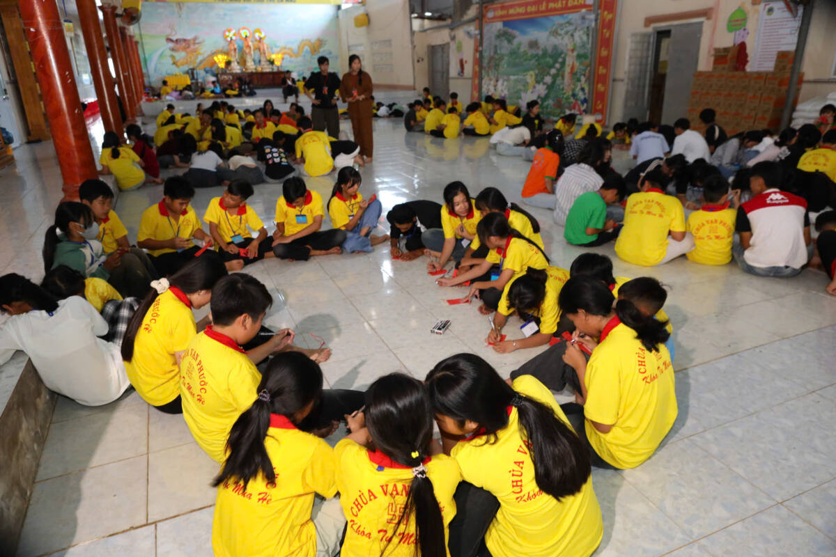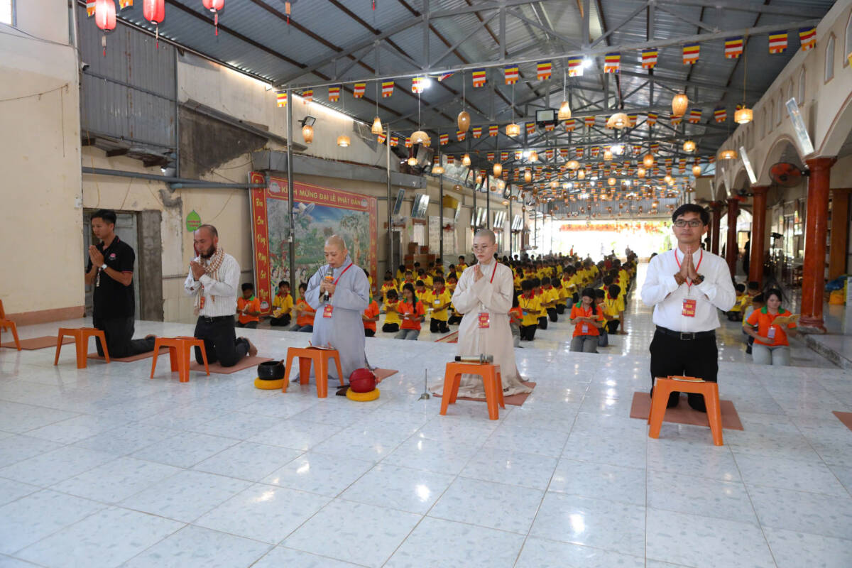Khi những tia nắng ấm đầu ngày lan tỏa nơi miền quê yên bình, đại chúng cùng trở về hội trường, lắng lòng thanh tịnh. Trong không khí trang nghiêm, các bạn được chư Tôn đức hướng dẫn tập thể dục, thiền hành, dâng hoa cúng dường mười phương chư Phật, học theo hạnh nguyện lắng nghe của đức Bồ tát Quan Thế Âm, phát nguyện làm lành, lánh ác, sống hiếu thảo, trở thành những công dân có ích, góp phần xây dựng quê hương giàu đẹp, nghĩa tình.