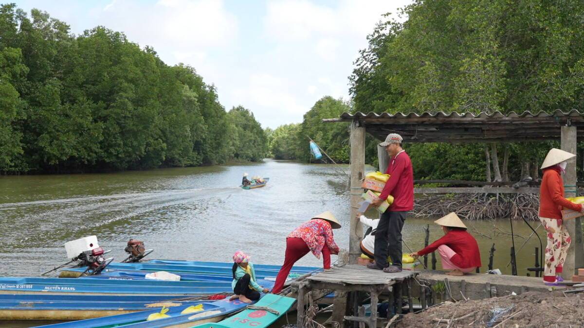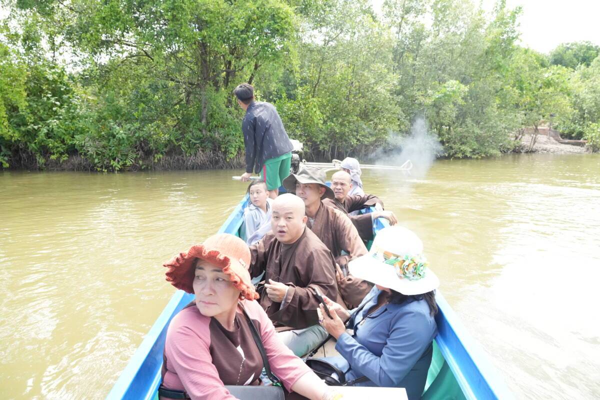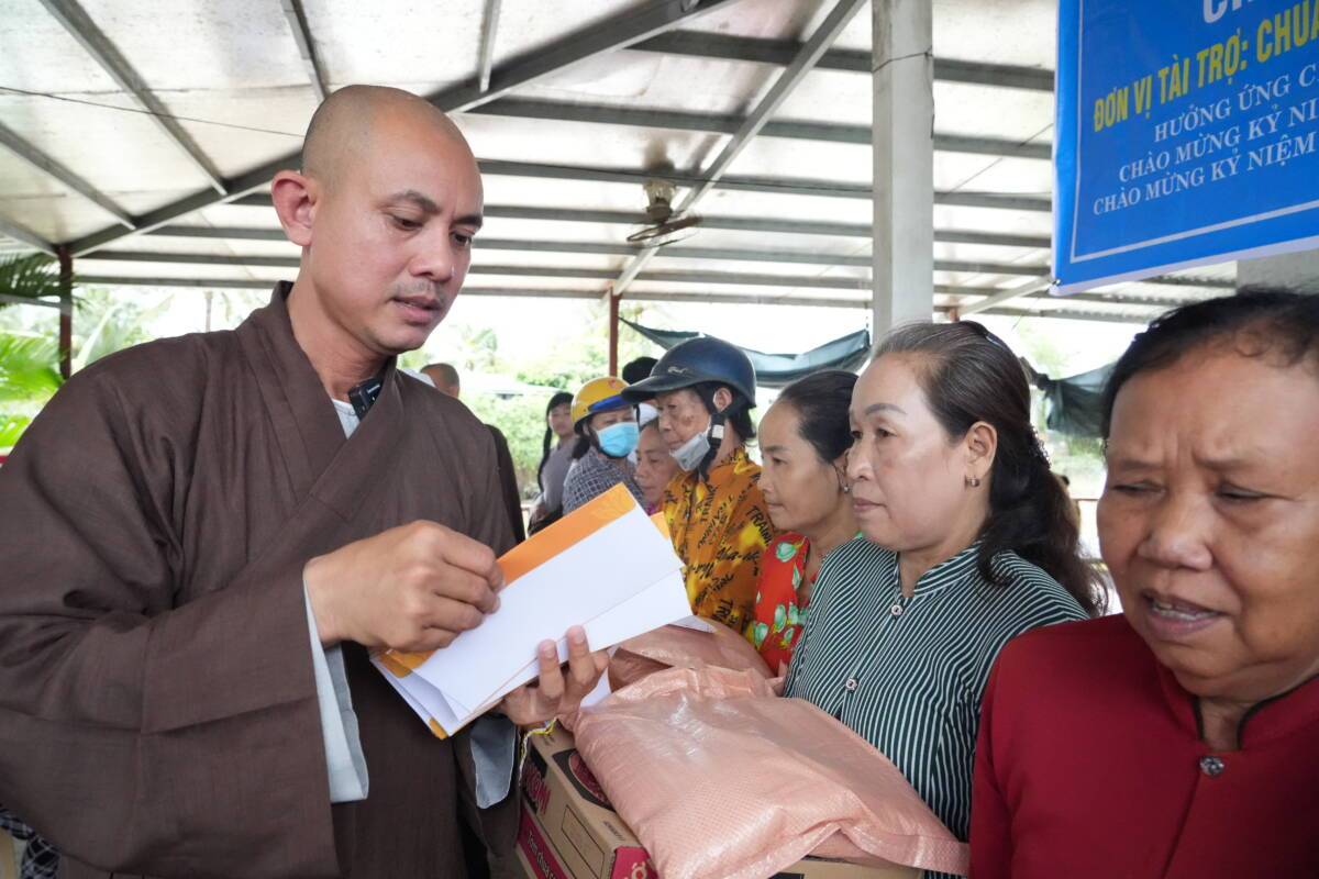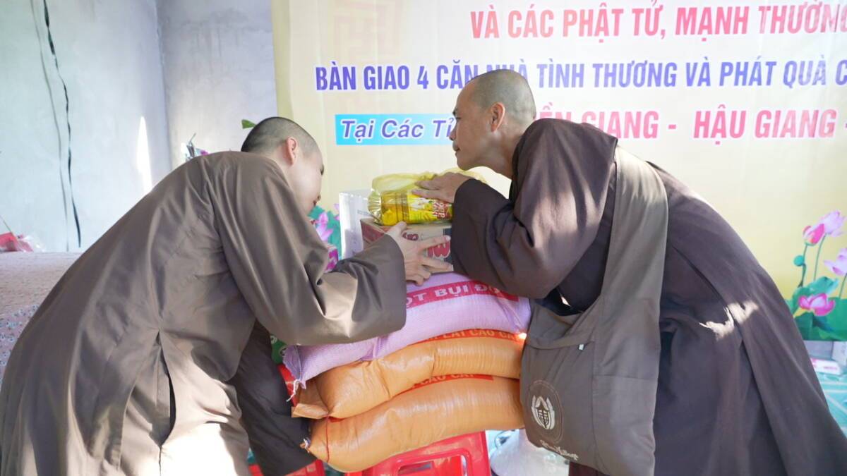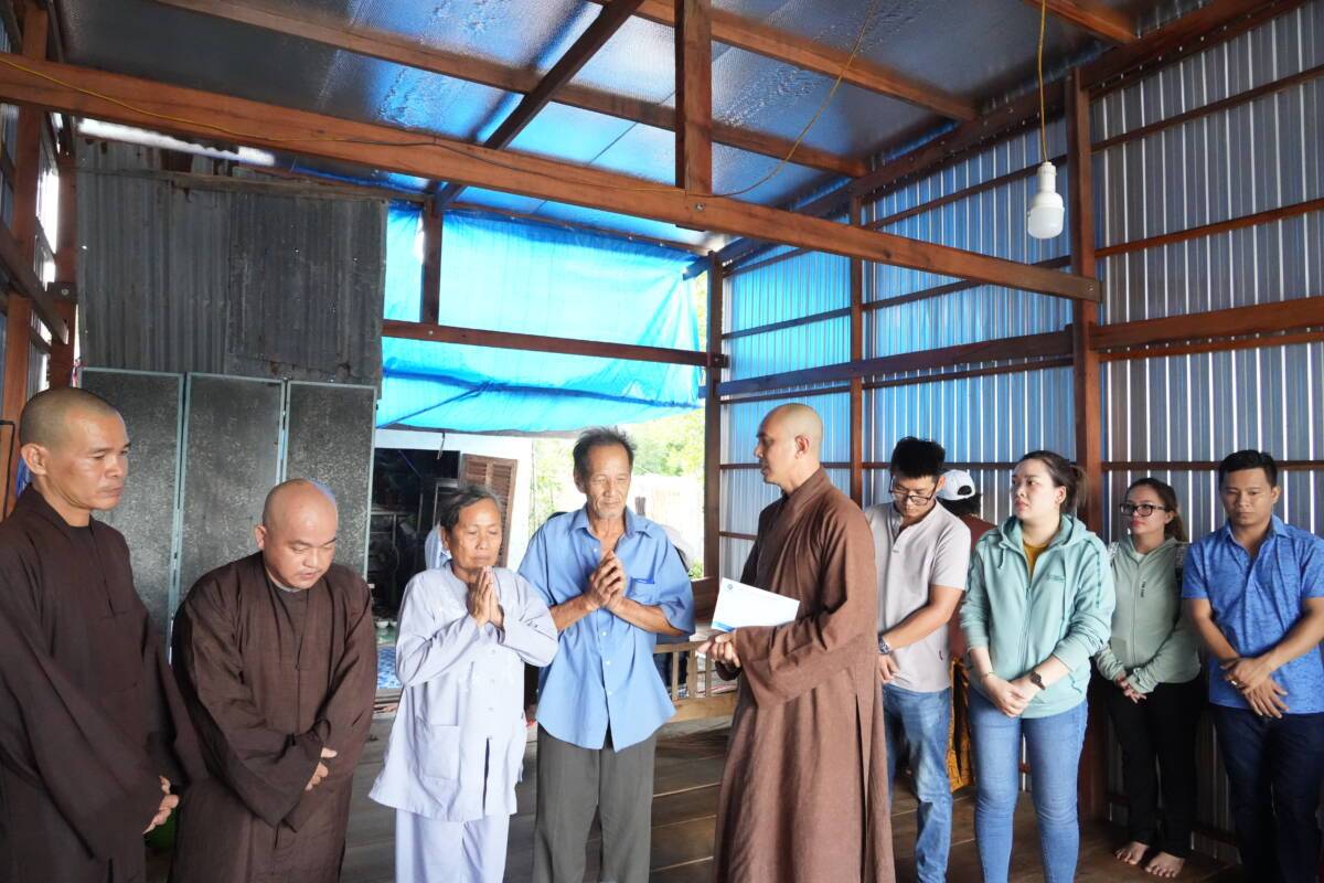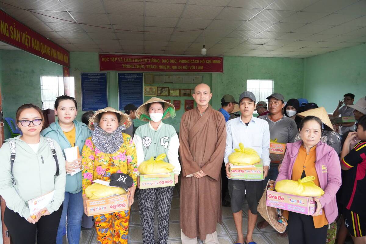 Sau nhiều thời gian di chuyển bằng đường bộ và ghe xuồng, đến với tỉnh Cà Mau Chư tôn đức tới huyện năm căn vùng đất mũi đoàn đã trao tặng 100 phần quà cho bà con có hoàn cảnh khó khăn và bàn giao một căn nhà chống lũ cho gia đình bà Quách Thị Nga.