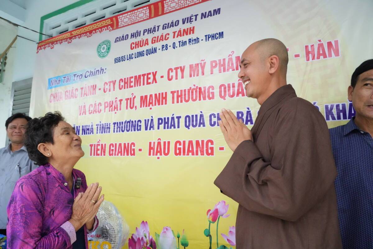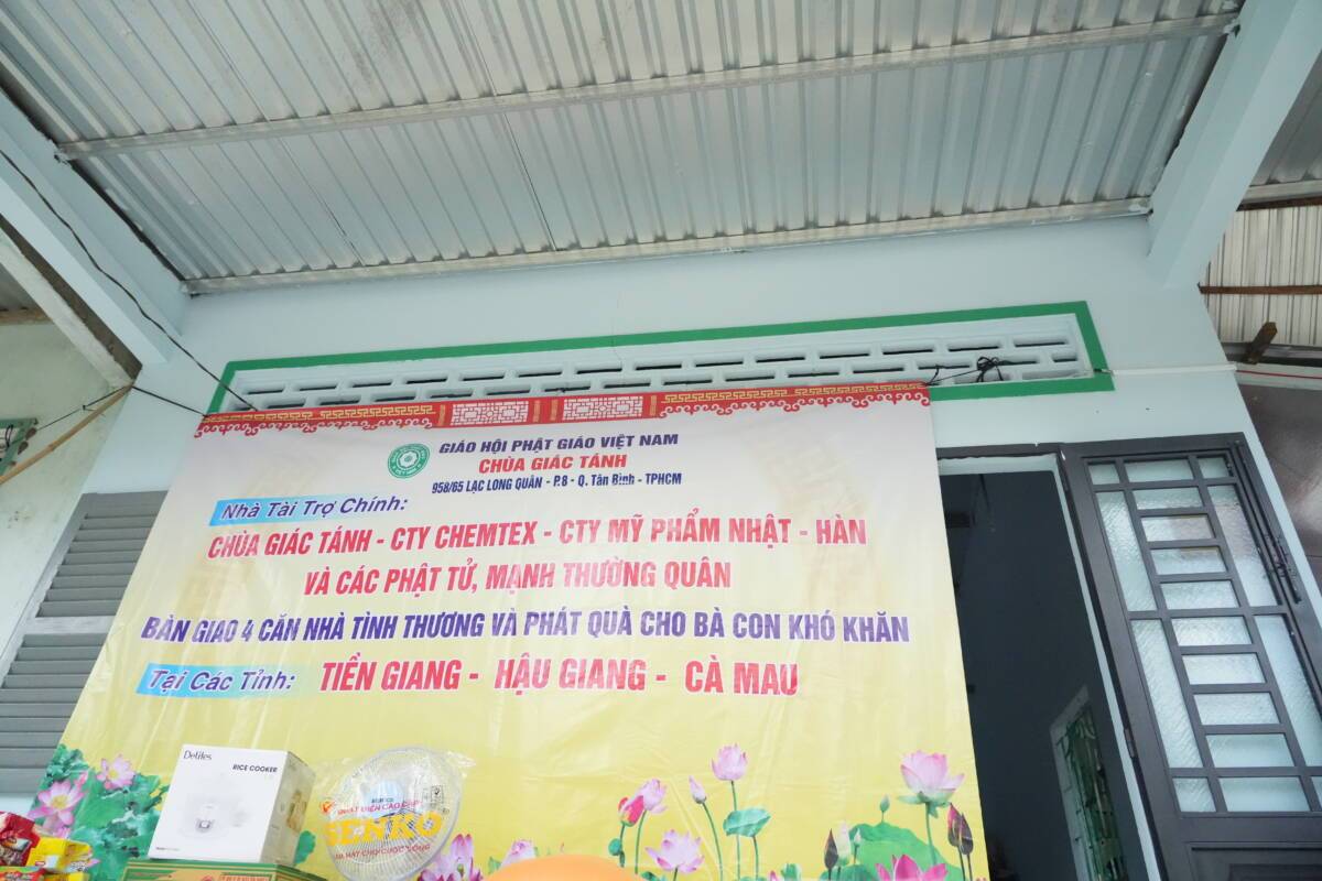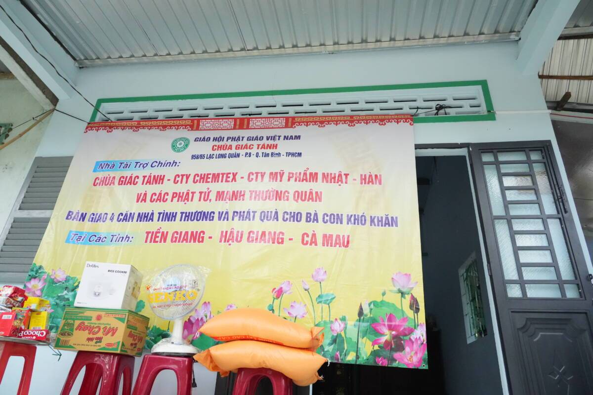 Tại tỉnh Tiền Giang đoàn đã ban giao cho gia đình anh Trần Đương xã Tân Thới huyện Tân Phú Đông, căn nhà được xây dựng hơn 60m2, gồm 03 phòng ngủ và 1 phòng khách, để có được nụ cười của anh thì chư tôn đức đã mất hai tháng để xây dựng căn nhà từ khi khảo sát, với anh phải gần chục năm nay mới nở nụ cười tươi và thỏa mãn như vậy, gia đình anh có hoàn cảnh khó khăn thuộc hộ nghèo, hai vợ chồng làm mướn ngày hơn hai trăm ngàn một ngày công nhưng phải nuôi tới 5 người con, nhờ biết được chư tôn đức khảo sát xây dựng nhà cho hộ nghèo biết duyên đến Phật pháp, gia đình đã phát nguyện xin thỉnh tượng Phật từ chư tôn đức để thờ cho ngôi nhà mới được ấm cúng và biết ơn Tam Bảo hơn. Chư tôn đức và các mạnh thường quân cũng trao và hỗ trợ Tiền mặt để trang trí ngôi nhà và vật dụng cũng như nhu yếu phẩm cho ngôi nhà mới.