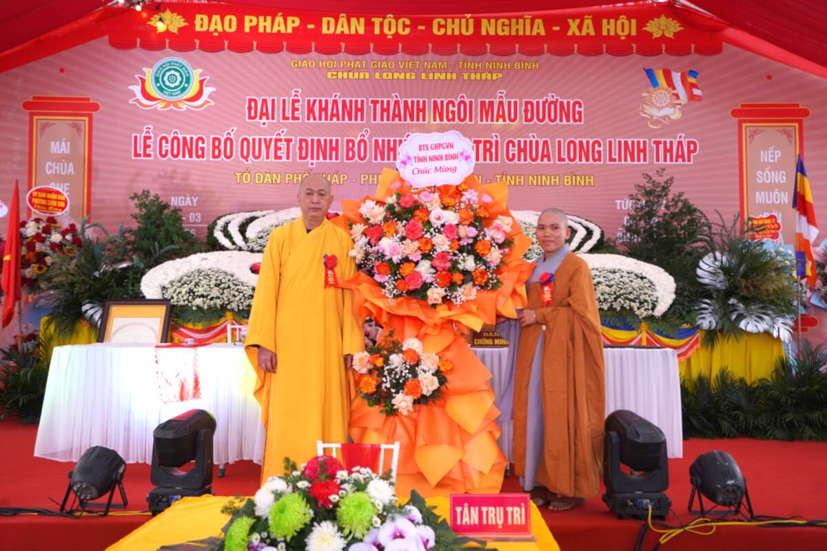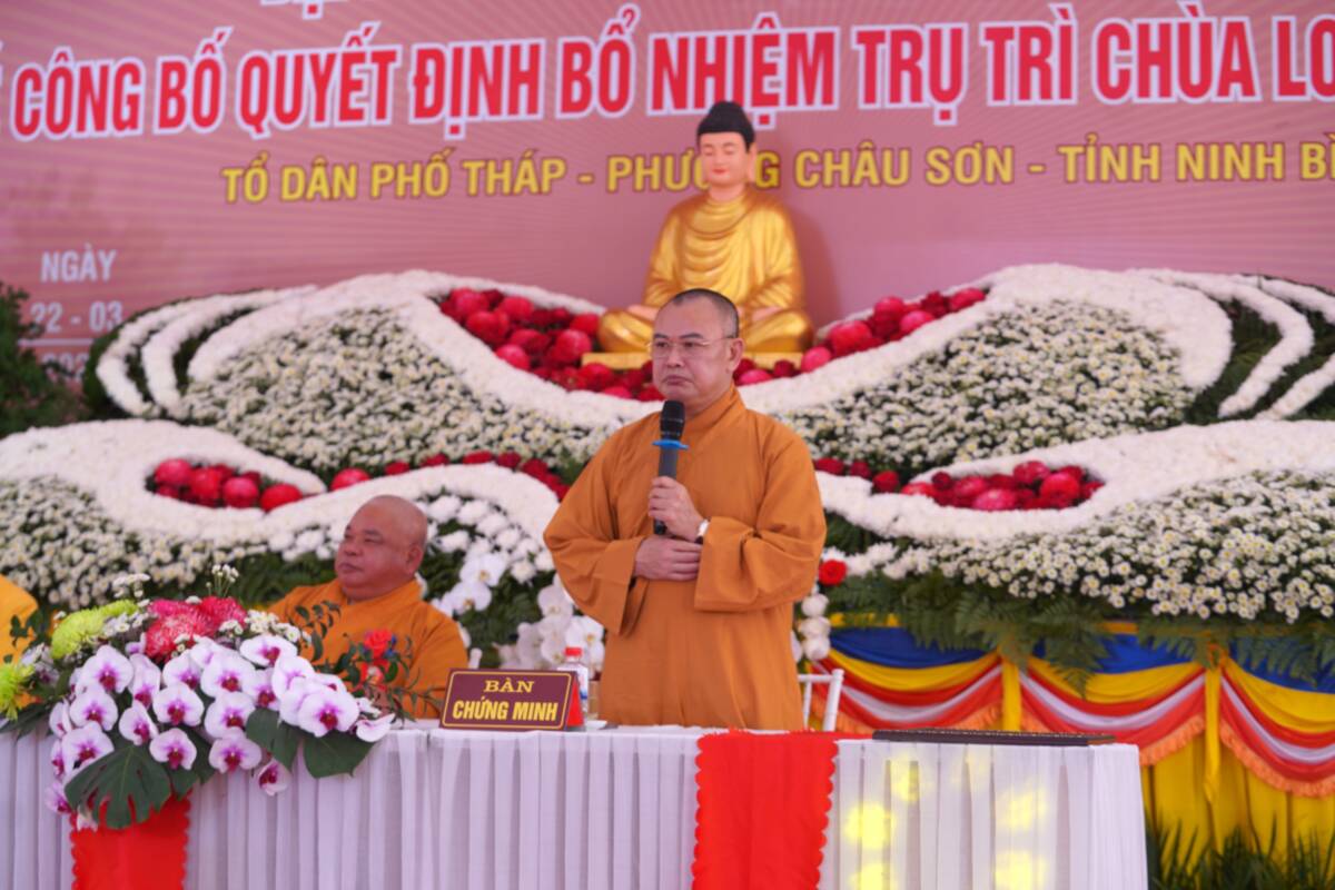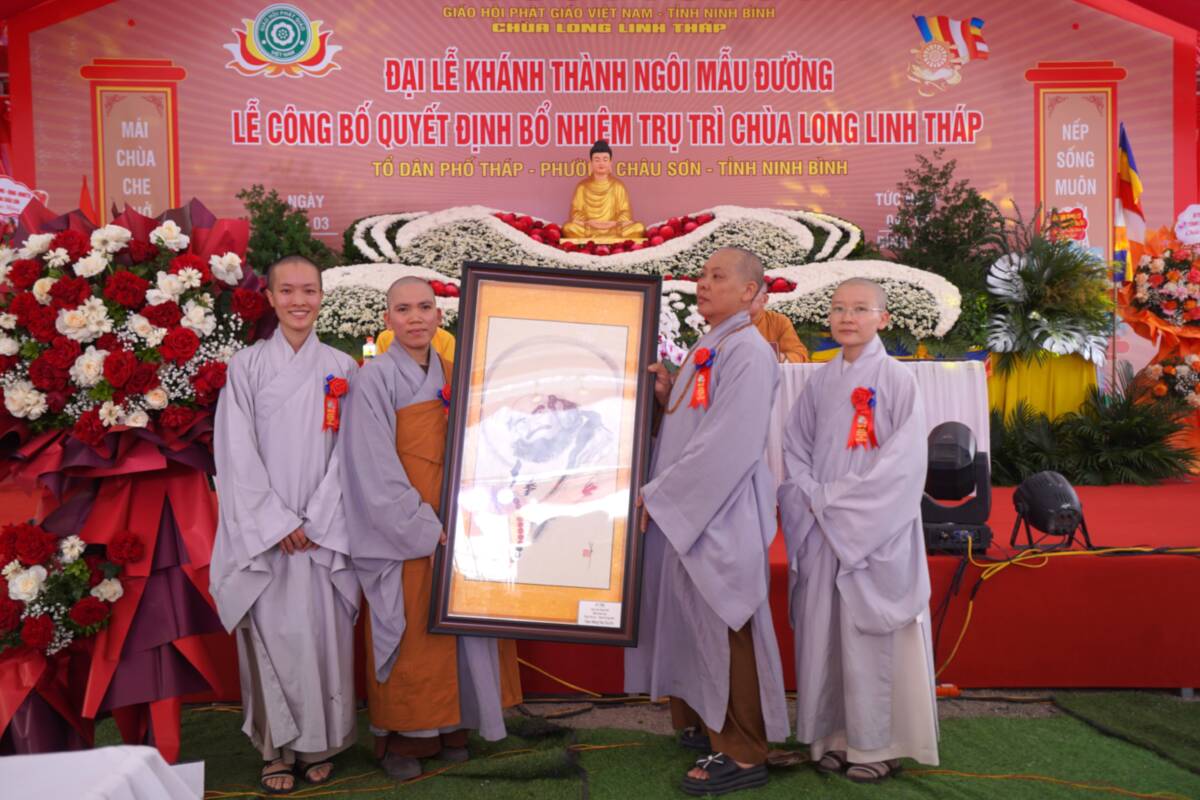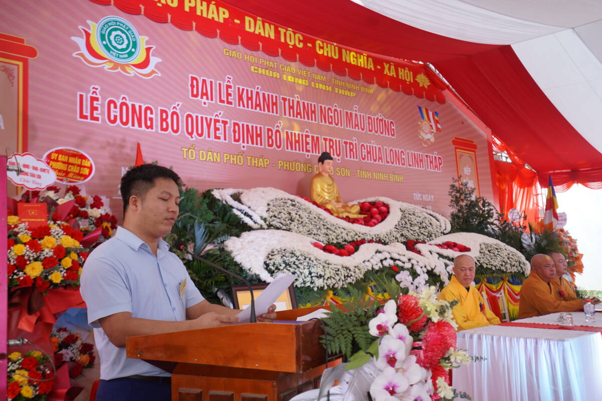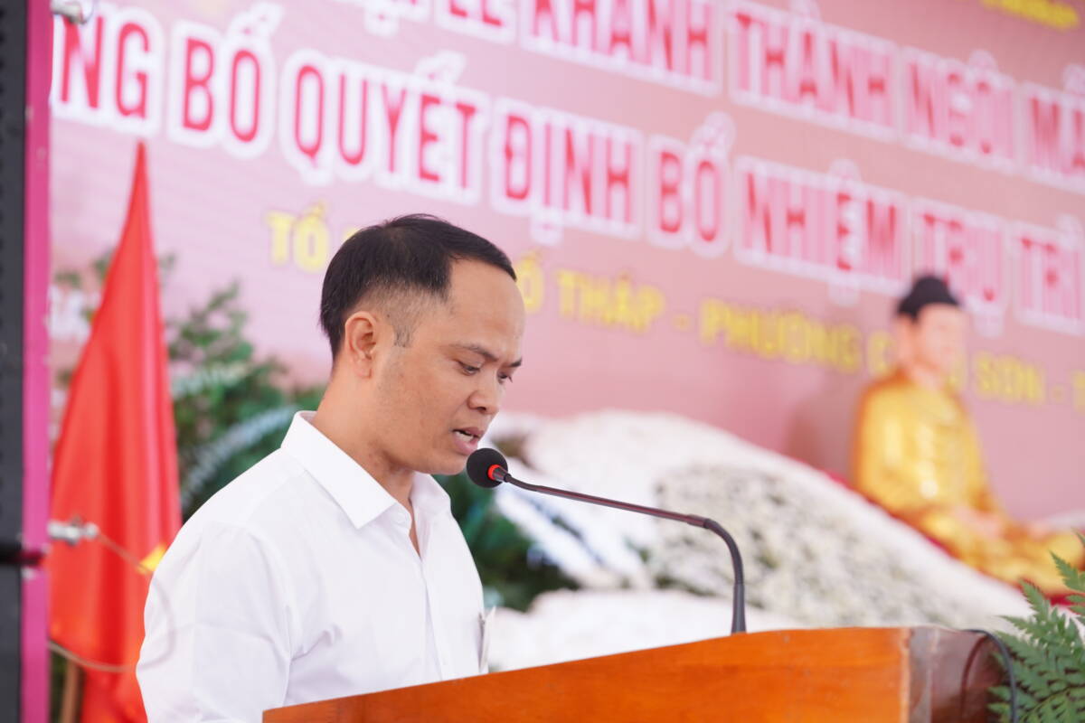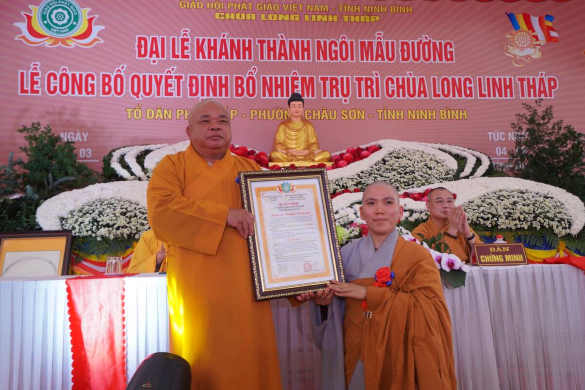 Điểm nhấn thiêng liêng nhất của buổi lễ chính là khoảnh khắc công bố Quyết định bổ nhiệm Sư thầy Thích Diệu Từ chính thức giữ trọng trách trụ trì chùa Long Linh Tháp. Đây không chỉ là sự ghi nhận hành trình tu tập, đạo hạnh của Sư thầy mà còn là sứ mệnh cao cả “Trụ pháp vương gia, trì Như Lai tạng”.