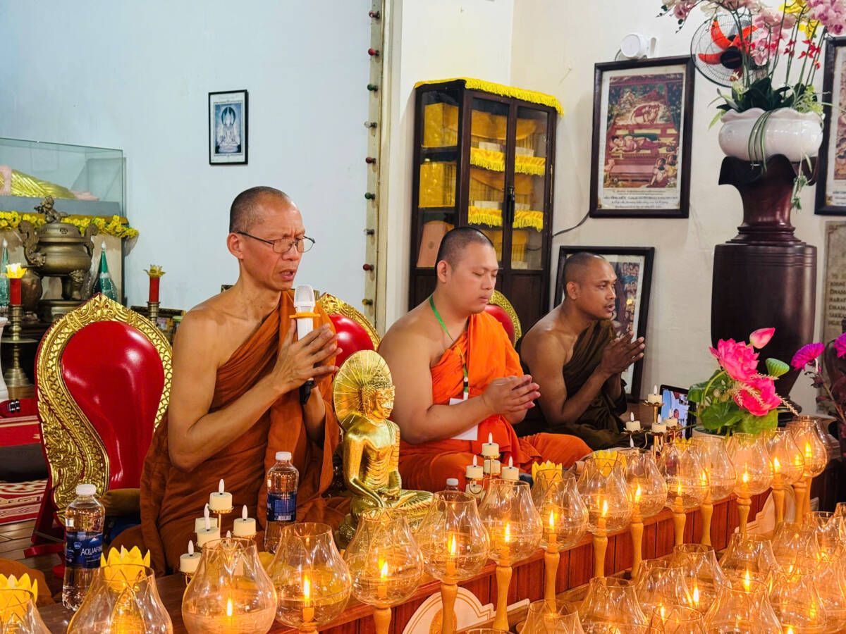 Nối tiếp dòng cảm xúc linh thiêng, Tăng đoàn và sinh viên Đại học MCU đã thực hiện các nghi thức tâm linh truyền thống: dâng hương cúng dường Tam Bảo và thiền hành niệm Phật. Những bước chân chánh niệm cùng ánh đèn hoa đăng lung linh nhiễu ba vòng quanh Đại Tháp Xá Lợi, Đại Thọ Bồ Đề và Kim Thân Phật đã kết tinh thành năng lượng bình an, cầu nguyện cho quốc thái dân an, thế giới hòa bình và chúng sanh an lạc. Cũng trong dịp này, các bạn sinh viên Thái Lan đã có những giây phút giao lưu nồng ấm với Phật tử Việt Nam, cùng nhau tìm hiểu những nét đẹp văn hoá Phật giáo truyền thống, sự gắn kết lâu đời qua các dòng phái, nghi lễ và kiến trúc di sản Thái Lan đang được gìn giữ trân trọng ngay tại mái chùa Việt.