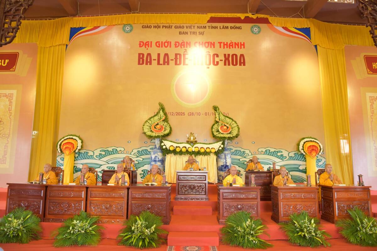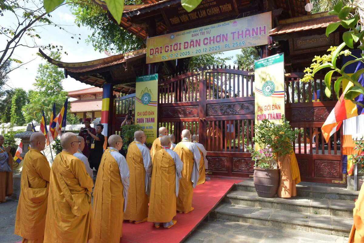PGĐS – Chiều ngày 18/12 và sáng ngày 19/12/2025 (nhằm ngày 29 và 30 tháng 10 năm Ất Tỵ), trong khuôn viên thanh tịnh của Giới trường Đại Giới đàn Chơn Thành – Phật lịch 2569, Hội đồng Thập sư đã trang nghiêm cử hành lễ truyền Đại giới Tỳ kheo và Tỳ kheo Ni cho chư Giới tử Tăng, Ni tại Tuyển Phật trường Thiền viện Trúc Lâm Chánh Thiện (xã Tân Lập, tỉnh Lâm Đồng).