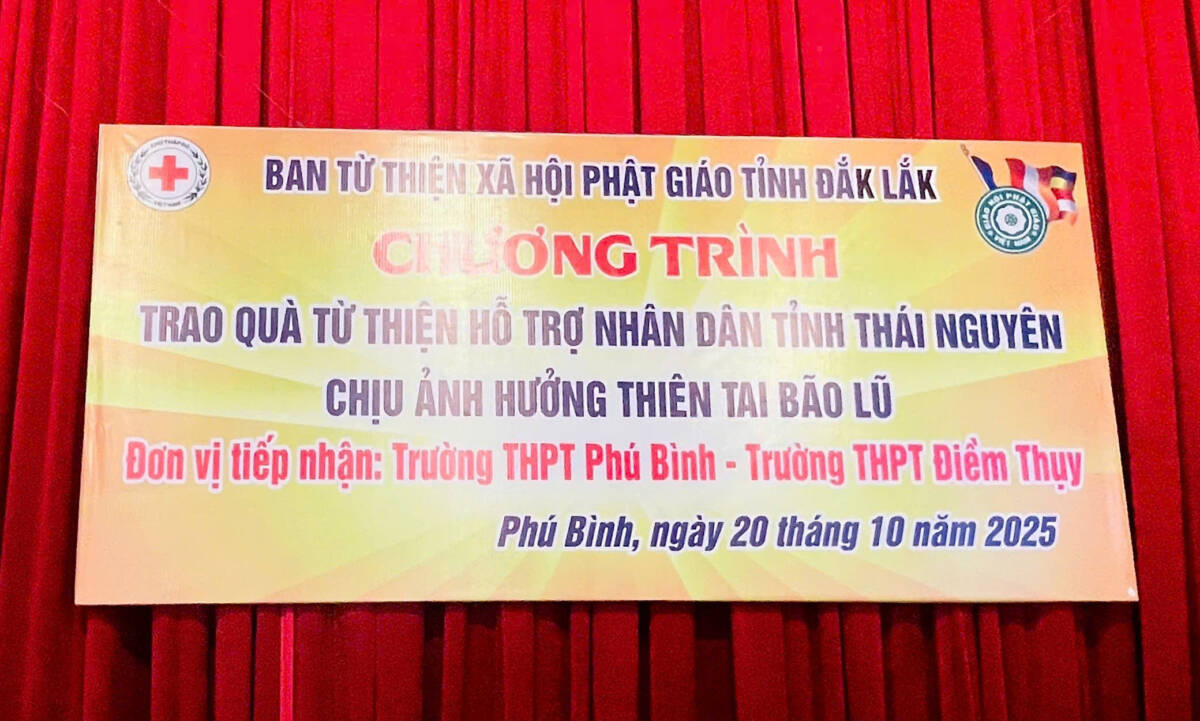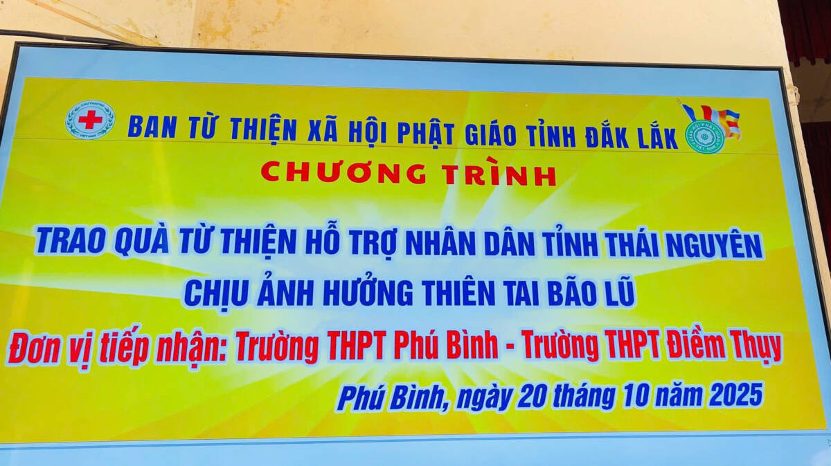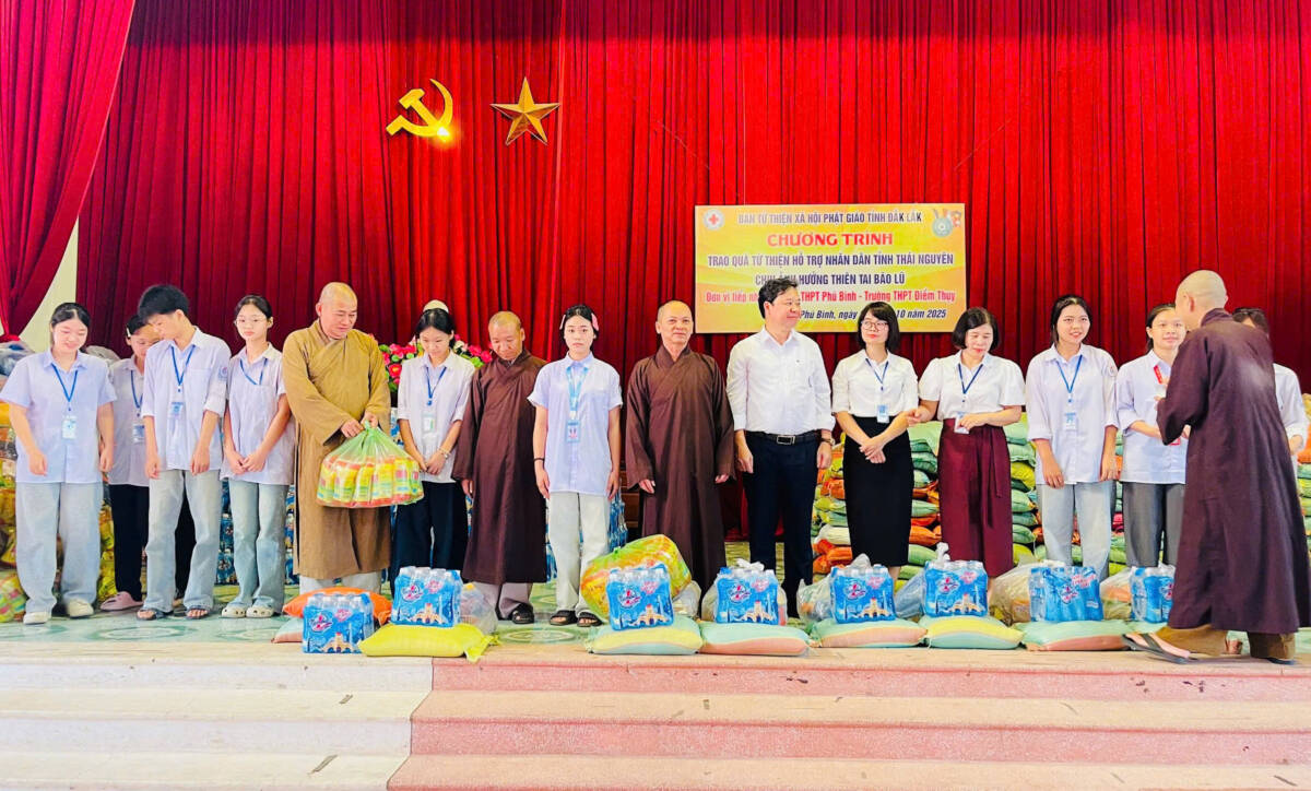 Ngày 20/10/2025, Ban Từ Thiện Xã Hội GHPGVN Tỉnh Đắk Lắk trao tặng 800 phần quà tại xã Phú Bình, tỉnh Thái Nguyên, nhằm hỗ trợ người dân tỉnh Thái Nguyên khắc phục hậu quả lũ lụt do cơn bão số 10,11 gây ra.