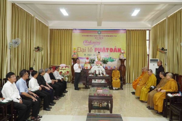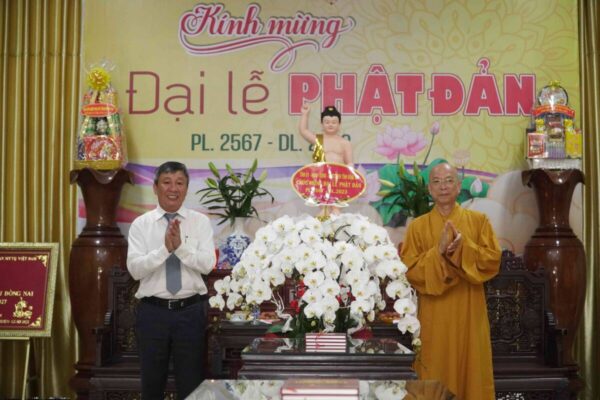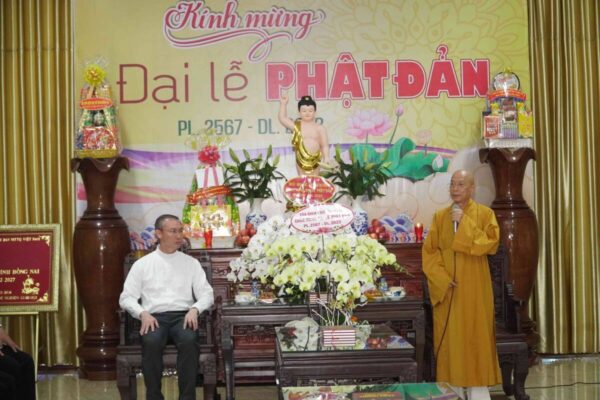 Đại diện đoàn lãnh đạo các cấp Tỉnh Ủy, ông Hồ Thanh Sơn đã phát biểu chúc mừng và thăm hỏi đến Chư tôn đức. Ông đã phát biểu nhân mùa Phật đản PL. 2567 – DL. 2023 Tỉnh ủy đã có thư chúc mừng Đại lễ Phật đản gửi đến Ban Trị sự tỉnh, Ban Trị sự các huyện và Thành phố cùng Chư Tăng Ni, Phật tử trên toàn tỉnh, đồng thời ông cũng nói lên một số vấn đề trong thời gian qua Tỉnh Đồng Nai đã chịu ảnh hưởng tình hình chung trên toàn thế giới, làm cho mọi công tác bị đình trệ, kèm theo hệ lụy đó là bà con nhân dân đang gặp nhiều khó khăn trong cuộc sống. Hôm nay, nhân mùa Phật đản Ông xin gửi lời chúc mừng và chia sẽ đến Chư tôn đức và tín đồ Phật tử cùng đón một mùa Phật đản thật an vui và hạnh phúc. Ông cũng xin ghi nhận những công đức to lớn của Ban Trị sự GHPGVN tỉnh đã tổ chức những công tác Thiện nguyện hướng về ngày Phật đản sanh, giúp cho bà con vượt qua được những khó khăn trong cuộc sống.