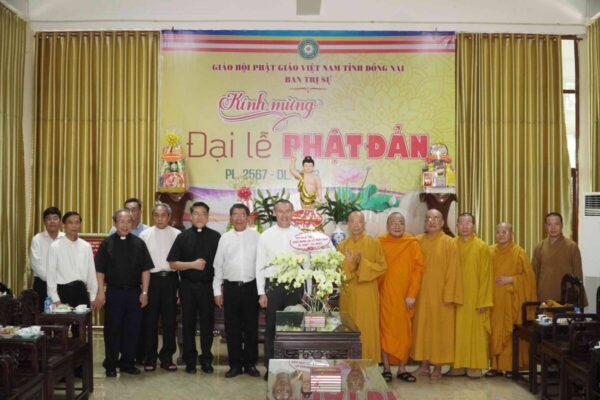 Đón tiếp đoàn Giáo hội Công giáo, Tòa Giám mục Xuân Lộc, TT. Thích Huệ Khai cùng chư tôn đức đã hoan hỷ và tiếp nhận lẵng hoa chúc mừng. Thượng tọa cũng Tri ân sự quan tâm của Tôn giáo bạn trong ngày lễ trọng đại của Phật giáo nói chung và Ban Trị sự GHPGVN tỉnh Đồng Nai nói riêng.