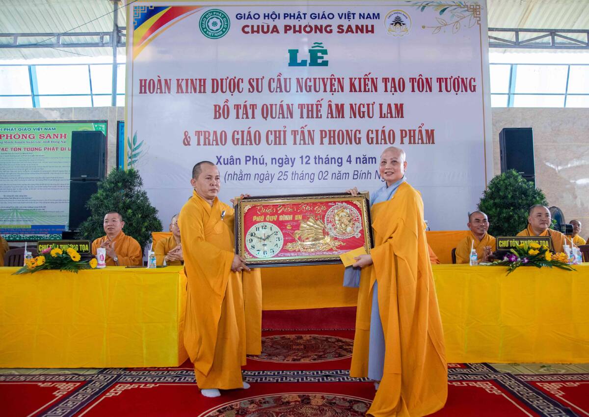 Sau đó TT. Thích Chơn Lý – UVDK HĐTS GHPGVN, Phó BTS GHPGVN tỉnh Đồng Nai thay mặt Thường trực BTS GHPGVN tỉnh đã trang trọng trao Giáo chỉ tấn phong hàng Giáo phẩm Thượng tọa đối với Thượng tọa trụ trì.