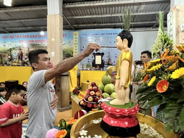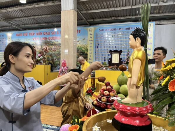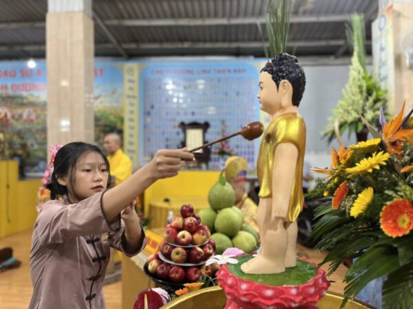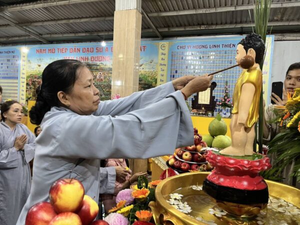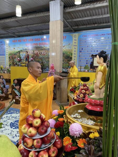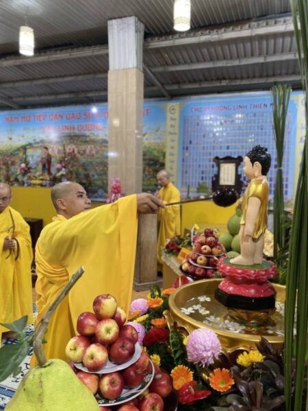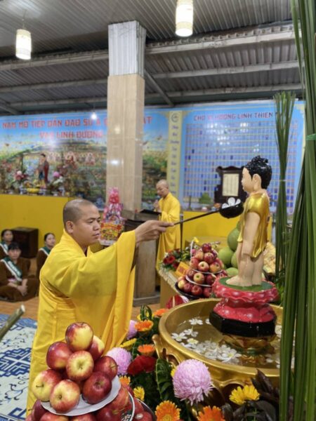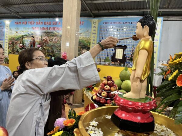 Buổi lễ Khánh đản hôm nay tại Chùa Vạn Phước Quảng Long được tổ chức trong sự trang nghiêm và thắm tình đạo vị với nghi thức: đảnh lễ và chiêm ngưỡng tôn dung đản sanh của đấng từ phụ, tiếp đó là nghi thức lễ tắm phật như khơi lại một hình ảnh “Chín Rồng phun nước, Bảy bước xưng Tôn”.