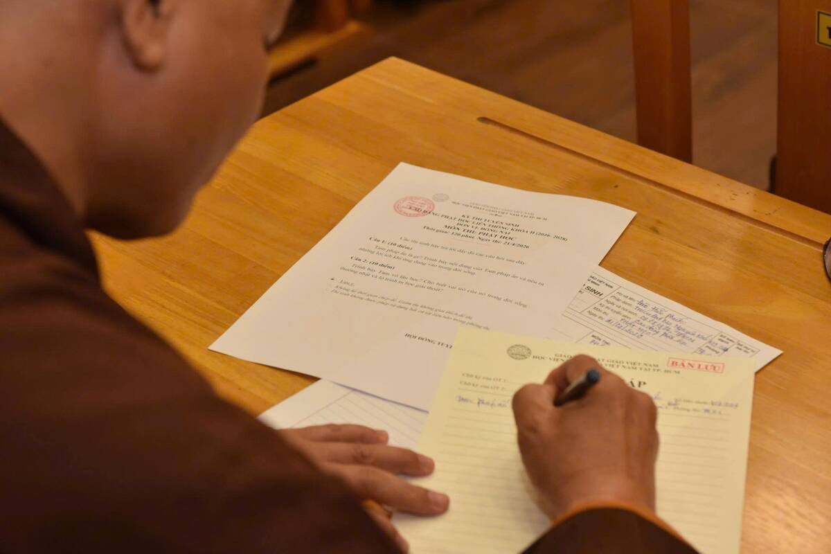 Ngay sau đó, sự minh bạch và trang trọng được thể hiện qua nghi thức trao đề thi niêm phong giữa TT. Thích Quang Thạnh – Phó Viện trưởng Học viện và ĐĐ. Thích Đạt-Ma Quang Tuệ – Phó Chủ nhiệm Thường trực lớp. Những bộ đề thi về Phật học, Văn học Việt Nam và Hán cổ không chỉ là thử thách về tri thức, mà còn là thước đo cho sự nỗ lực không ngừng nghỉ của những người con Phật trên lộ trình hoàn thiện bản thân.