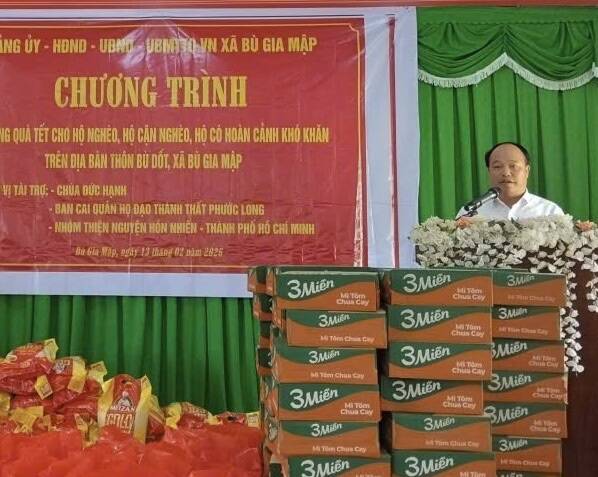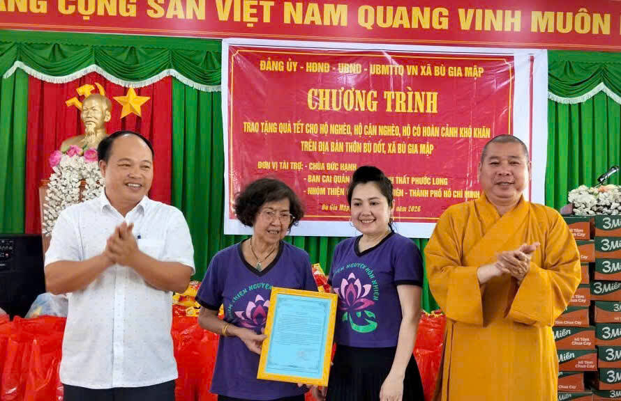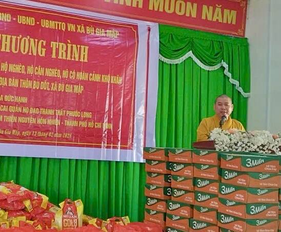 PGĐS- Trong ba ngày 11, 12 và 13/02/2026 (24, 25 và 26 tháng Chạp năm Ất Tỵ) ĐĐ.Thích Minh Hậu, ủy viên thường trực BTS PG tỉnh, Phó Ban Hoằng pháp Phật giáo tỉnh Đồng Nai, trụ trì chùa Đức Hạnh (thôn Phước Sơn, xã Phú Nghĩa) đã hướng dẫn các tổ chức và cá nhân trao tặng 400 phần quà Tết Bính Ngọ đến đồng bào và các bệnh nhân miền biên giới.