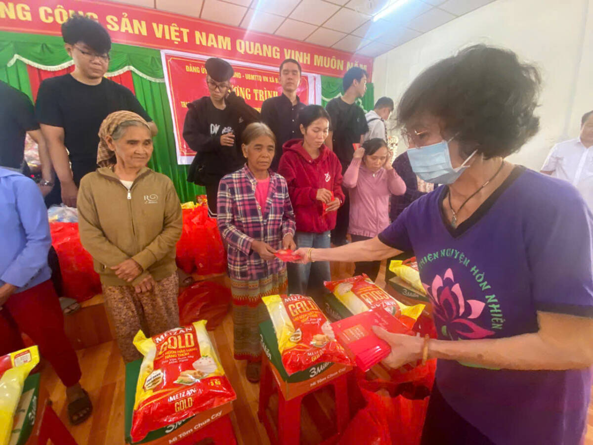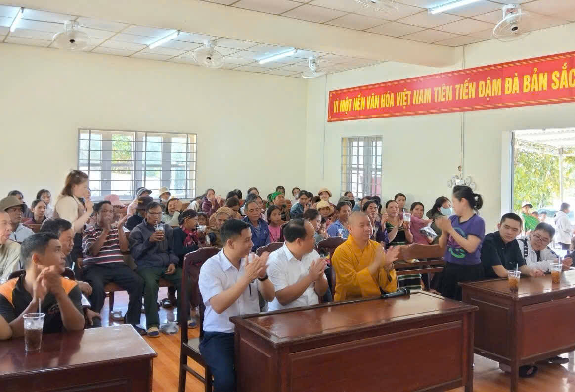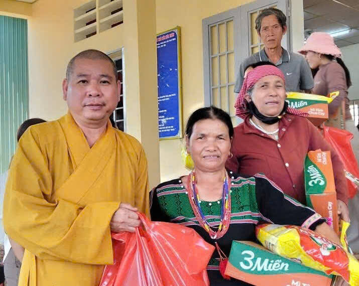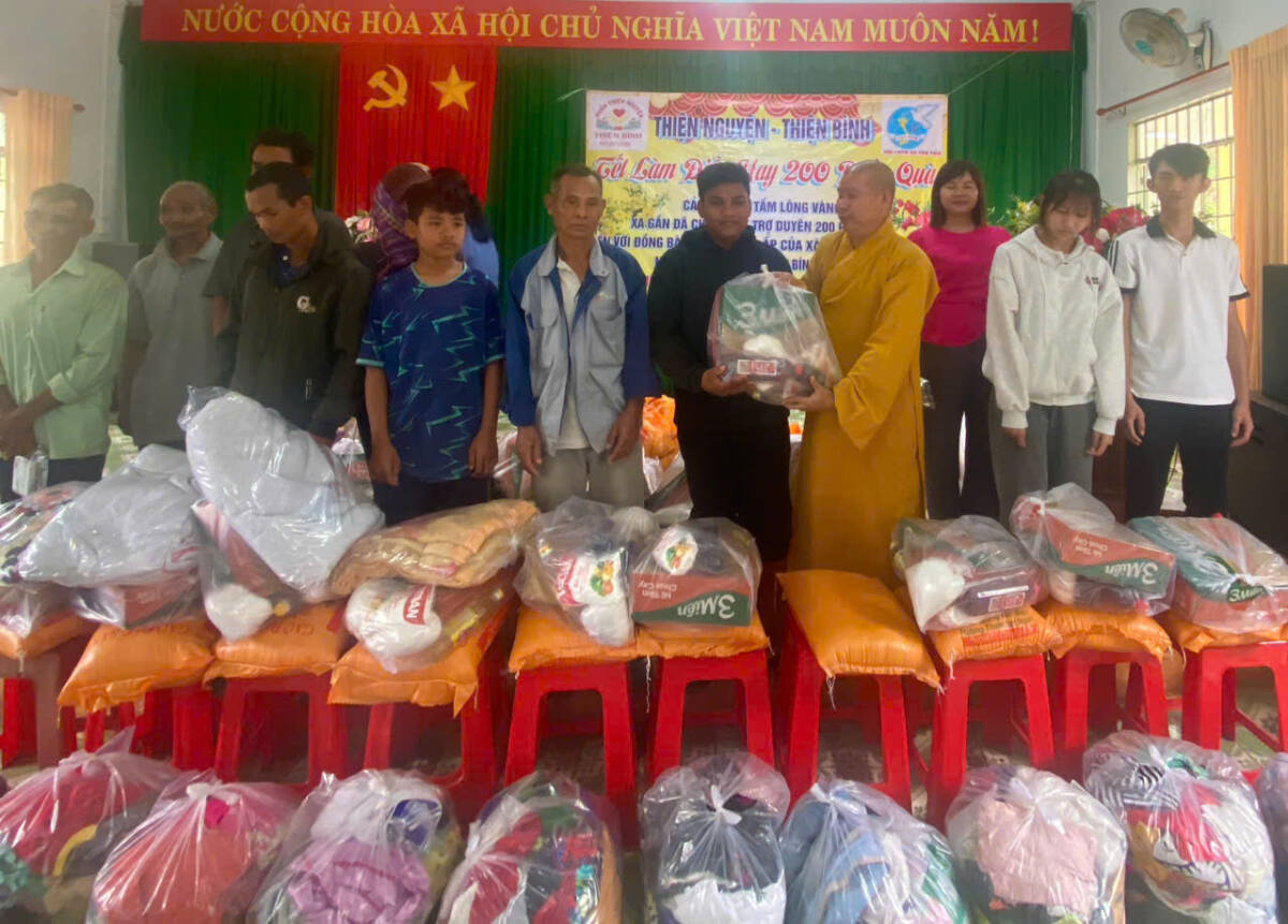 Tại đây, Đại đức trụ trì phối hợp cùng ông Nguyễn Văn Khải, Phó Chủ tịch UBND xã Bù Gia Mập, hướng dẫn nhóm thiện nguyện Hồn Nhiên (TP.HCM) trao 100 phần quà Tết đến các hộ gia đình khó khăn, mỗi phần trị giá 500 ngàn đồng. Những phần quà được trao tận tay bà con trong niềm vui mộc mạc; có cụ già run run đón nhận, có em nhỏ nép sau lưng mẹ nhưng vẫn ánh lên nét vô tư.