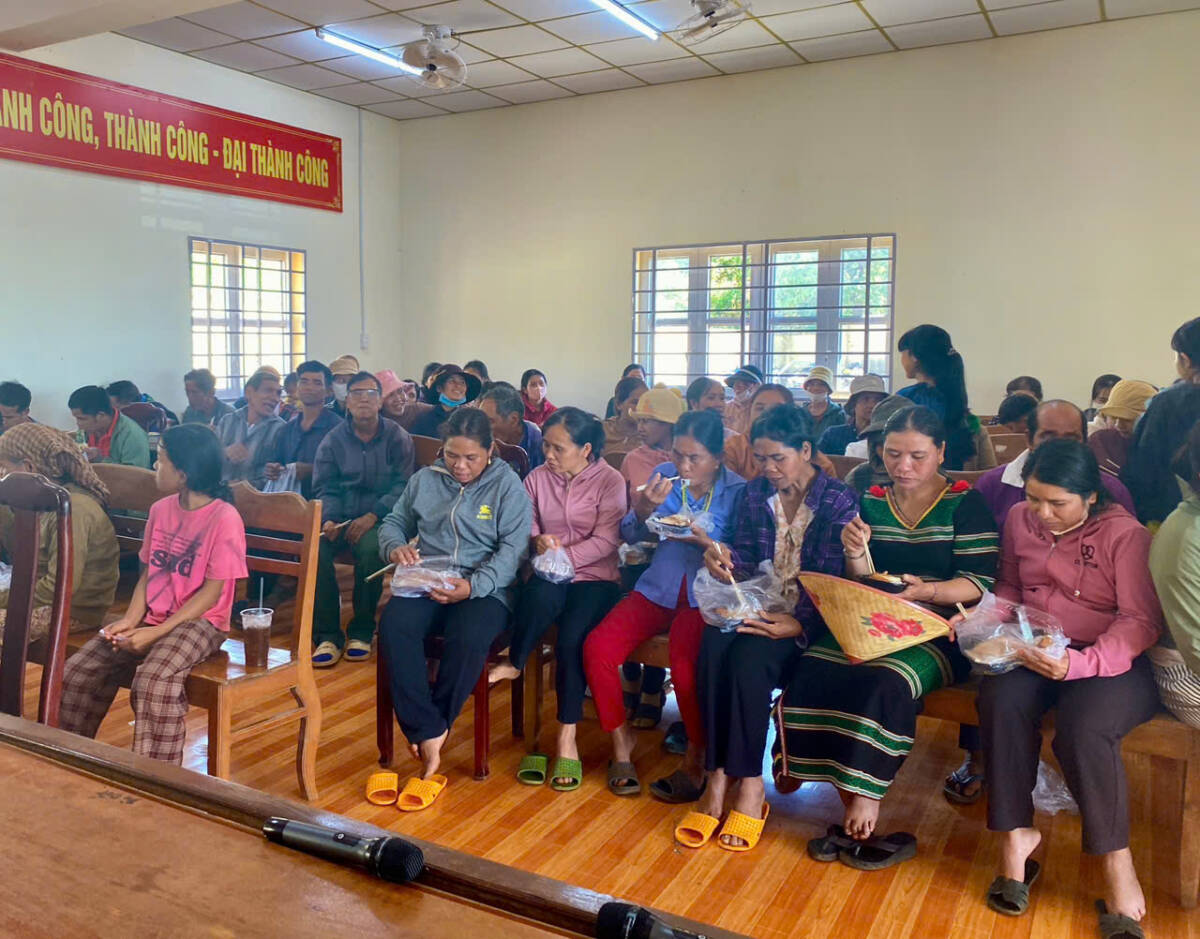 Bên cạnh đó, đoàn chuẩn bị 300 phần bánh ướt phục vụ bà con dùng tại chỗ, tạo nên một buổi tất niên ấm tình người. Trong không gian giản dị của Nhà văn hóa thôn, bà con quây quần bên nhau, thưởng thức bữa ăn nhẹ nhàng, ngon miệng. Tiếng nói cười vang lên giữa núi rừng như xua tan cái se lạnh cuối năm.
