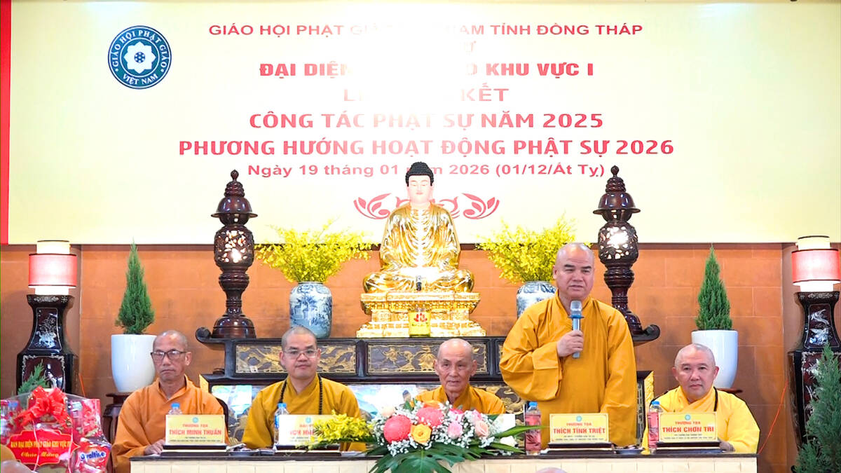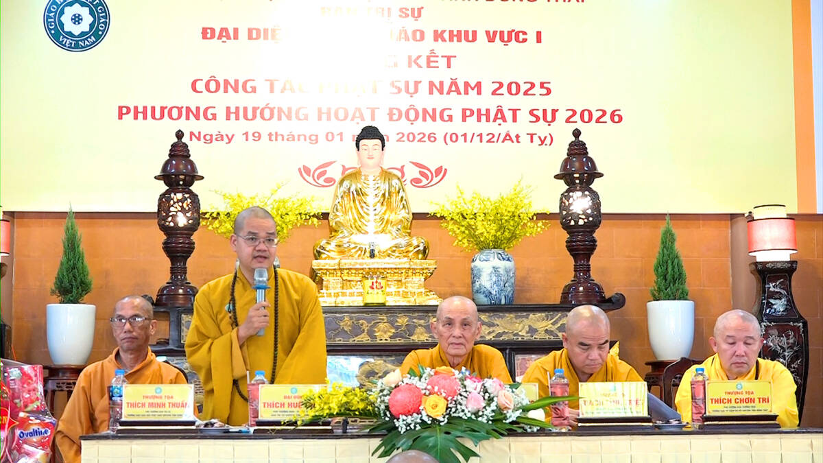 Hội nghị được lắng nghe lời đạo từ và chỉ đạo từ Thượng tọa Thích Tĩnh Triệt. Thượng tọa đã tán dương những thành quả mà Phật giáo Khu vực 1 đạt được, đặc biệt là con số ấn tượng trong công tác từ thiện xã hội. Thượng tọa mong muốn Tăng Ni, Phật tử tiếp tục phát huy tinh thần đoàn kết, hòa hợp để hoàn thành tốt các mục tiêu Phật sự trong năm mới 2026.