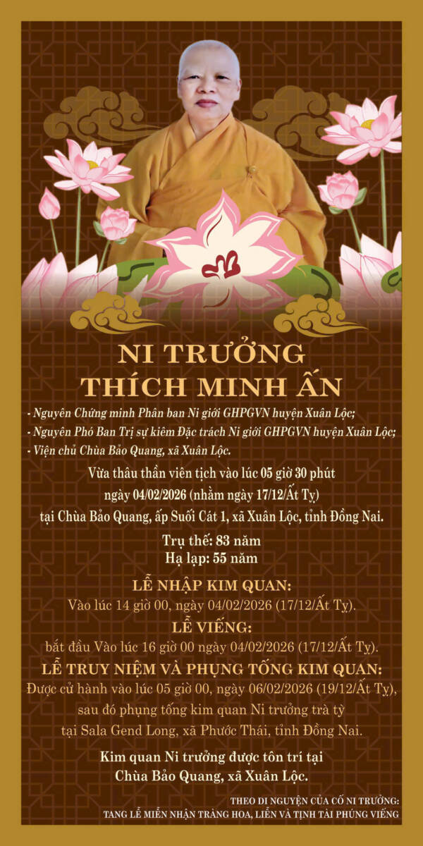 PGĐS – Hôm nay, 4-2-2026, Hòa thượng Thích Tâm Minh, Phó ban Trị sự GHPGVN tỉnh Đồng Nai đã thay mặt Ban Trị sự GHPGVN tỉnh, Đại diện Phật giáo xã Xuân Lộc cùng môn đồ pháp quyến ký cáo phó kính tiếc báo tin Ni trưởng Thích nữ Minh Ấn, viện chủ chùa Bảo Quang tân viên tịch.