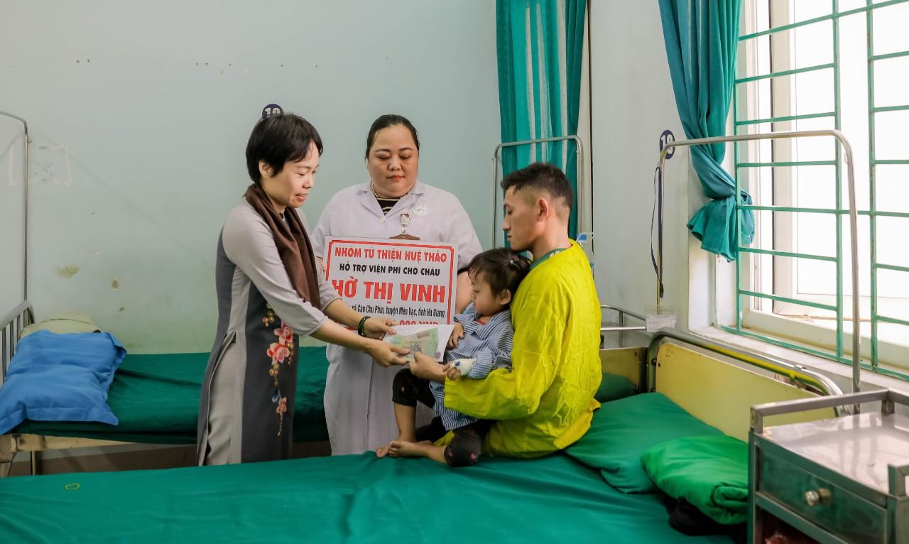 Tại khoa Ung bướu bệnh viện đa khoa tỉnh Hà Giang thay mặt cho các mạnh thường quân của nhóm từ thiện Huệ Thảo. Bà Lê Thị Ninh Phó chánh văn phòng BTTXH TƯ GHPGVN – ủy viên phân ban TTĐN&QHQT TƯ đã trao quà từ thiện cho bệnh nhân Hờ Thị Vinh sinh năm 2020 người dân tộc Mông có địa chỉ tại xã Cán Su Phìn, huyện Mèo Vạc bị bệnh ung thư nguyên bào với số tiền là 8.800.000đ.