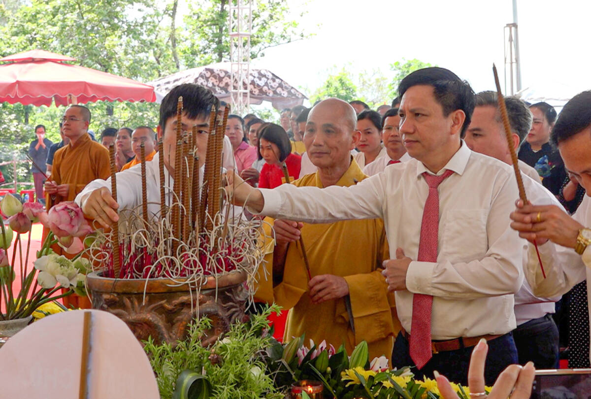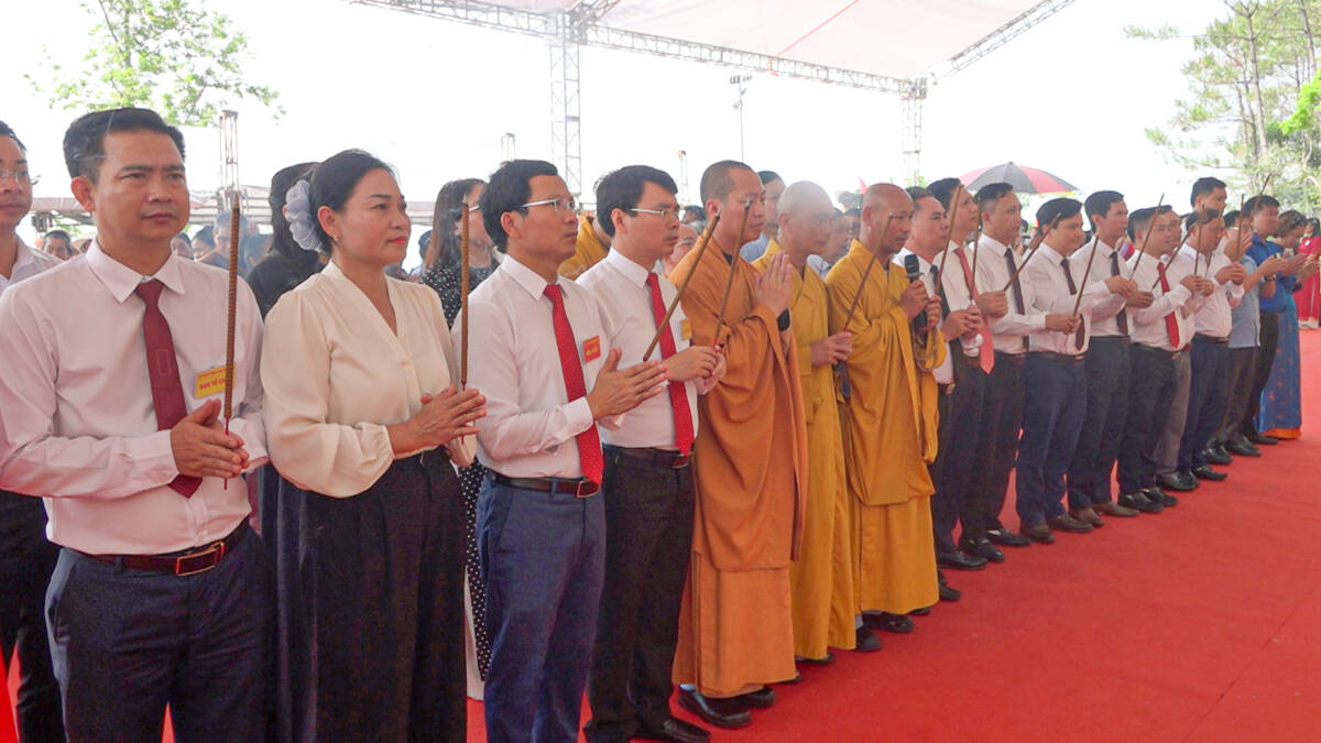Trong tiếng trống hội và khói hương trầm quyện tỏa, Chư tăng cùng các vị lãnh đạo chính quyền các đoàn đại biểu và nhân dân thành kính dâng hương, bày tỏ lòng biết ơn sâu sắc tới Thủy tổ các Vua Hùng – những người đã có công dựng nước và đặt nền móng cho dân tộc Việt Nam.