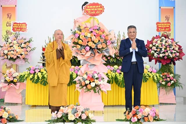 Dịp này, Ban Giám Hiệu trưởng trường Trung Cao đẳng Phật học thành phố Hải Phòng đã đón nhận những lẵng hoa tươi thắm chúc mừng của các cơ quan ban ngành đoàn thể thành phố, UB MTTQVN thành phố, Ban Tôn giáo Sở Nội vụ, Công an thành phố, Huyện ủy, HĐND, UBND, UB MTTQVN huyện An Dương, xã Bắc Sơn và đại diện các doanh nghiệp, các đạo tràng Phật tử trong thành phố.
