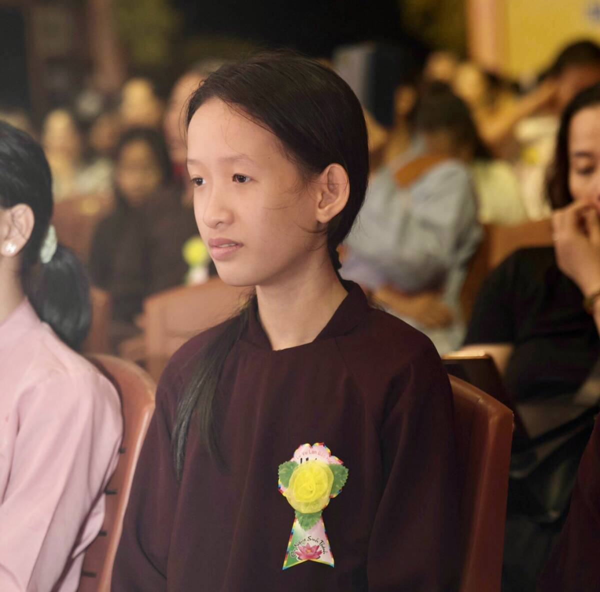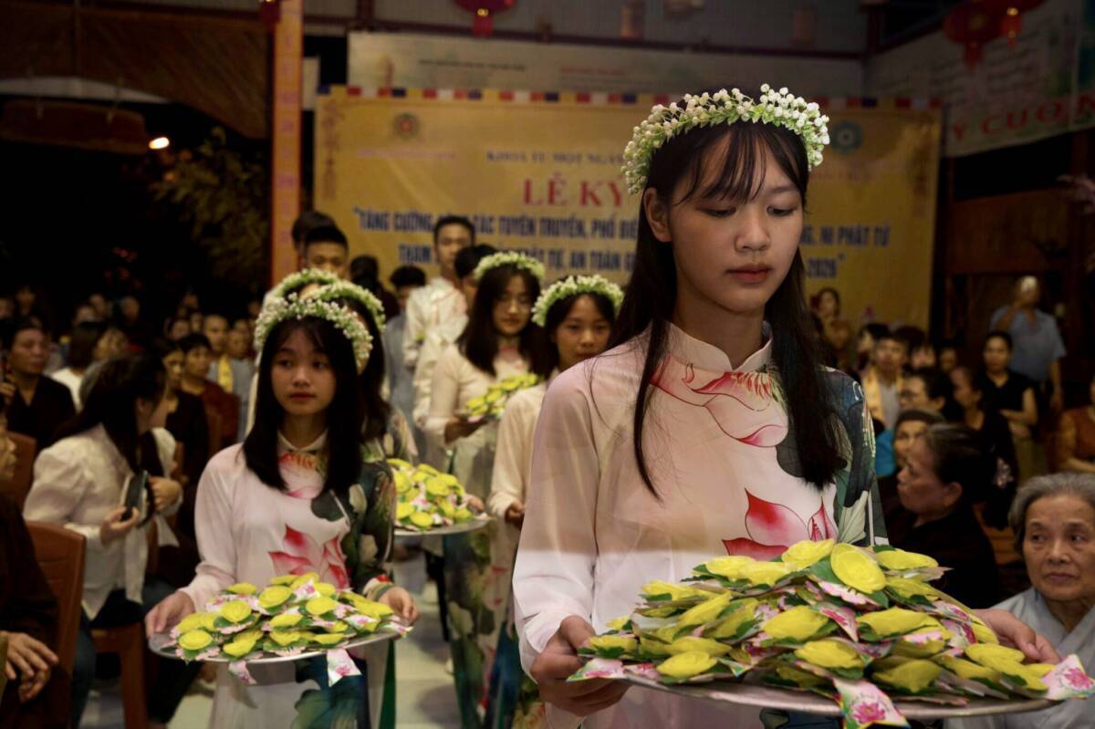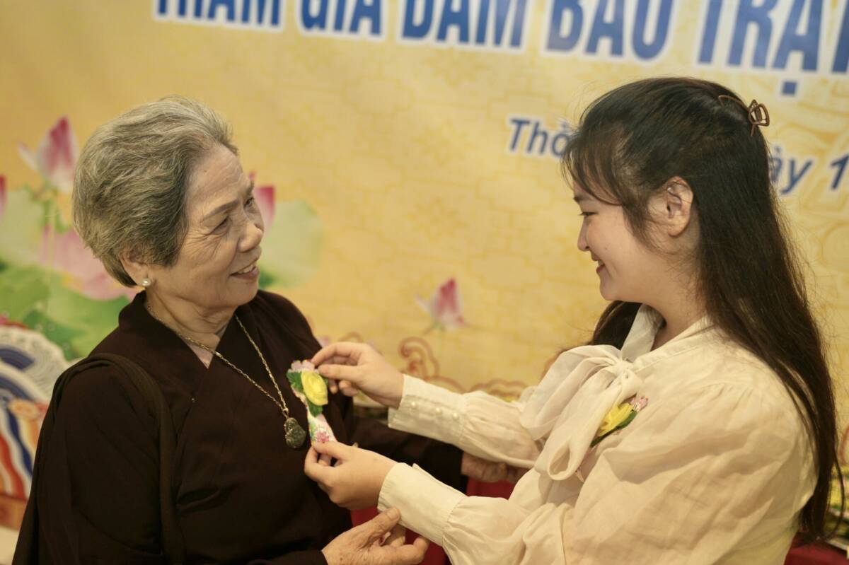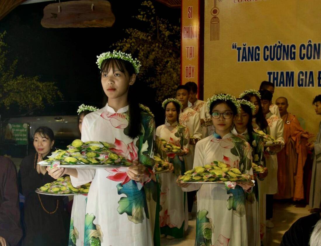 Các em học sinh trường THPTCS Sông Đà dâng cài hoa Hồng lên chư tôn Thiền đức Tăng, Ni và quý quan khách chính quyền Phật tử tham dự, và lễ dâng y do các Phật tử chùa Phật Quang Hoà Bình – Phật tử tịnh xá Chơn Ngôn Tông ’ đại diện cho hàng Phật tử trong buổi lễ.