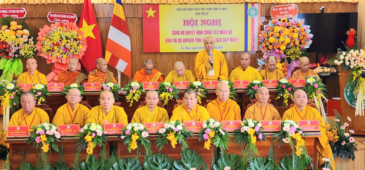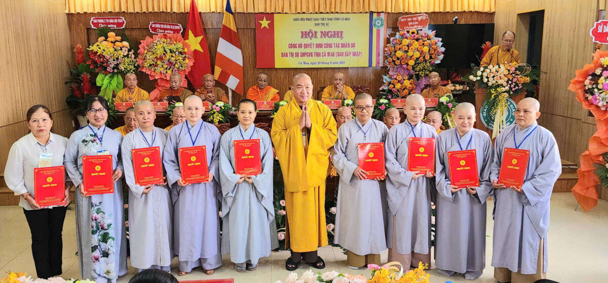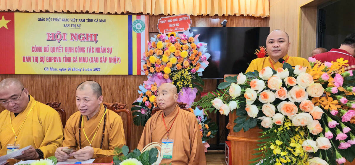 PGĐS- Chiều ngày 20/9/2025 (29 tháng Bảy Ất Tỵ), tại Hội trường UBMTTQVN tỉnh, Ban Trị sự GHPGVN tỉnh Cà Mau đã tổ chức Hội nghị Công bố và Trao quyết định của Hội đồng Trị sự về việc chuẩn y nhân sự Ban Trị sự GHPGVN tỉnh Cà Mau và 12 ban chuyên môn trực thuộc, nhiệm kỳ 2022-2027 sau sáp nhập.
