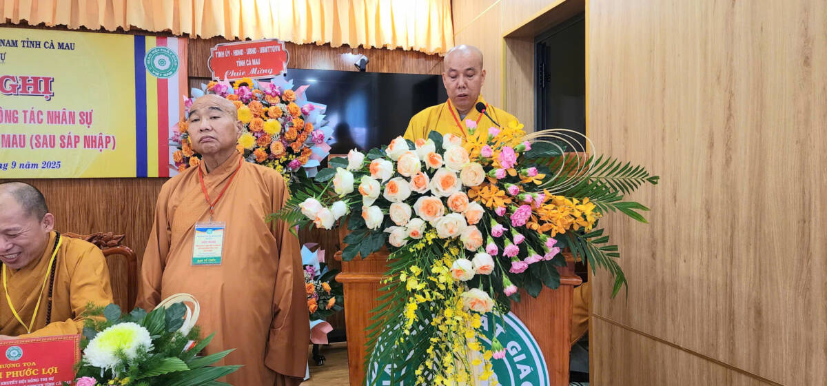 Thượng tọa Thích Minh Nhẫn công bố Quyết định số 346/QĐ-HĐTS ngày 30/06/2025 của Hội đồng Trị sự T.Ư về việc chuẩn y nhân sự Ban Trị sự GHPGVN tỉnh Cà Mau nhiệm kỳ 2022-2027 Ban Trị sự gồm: 107 thành viên.
