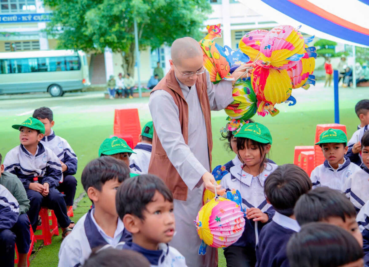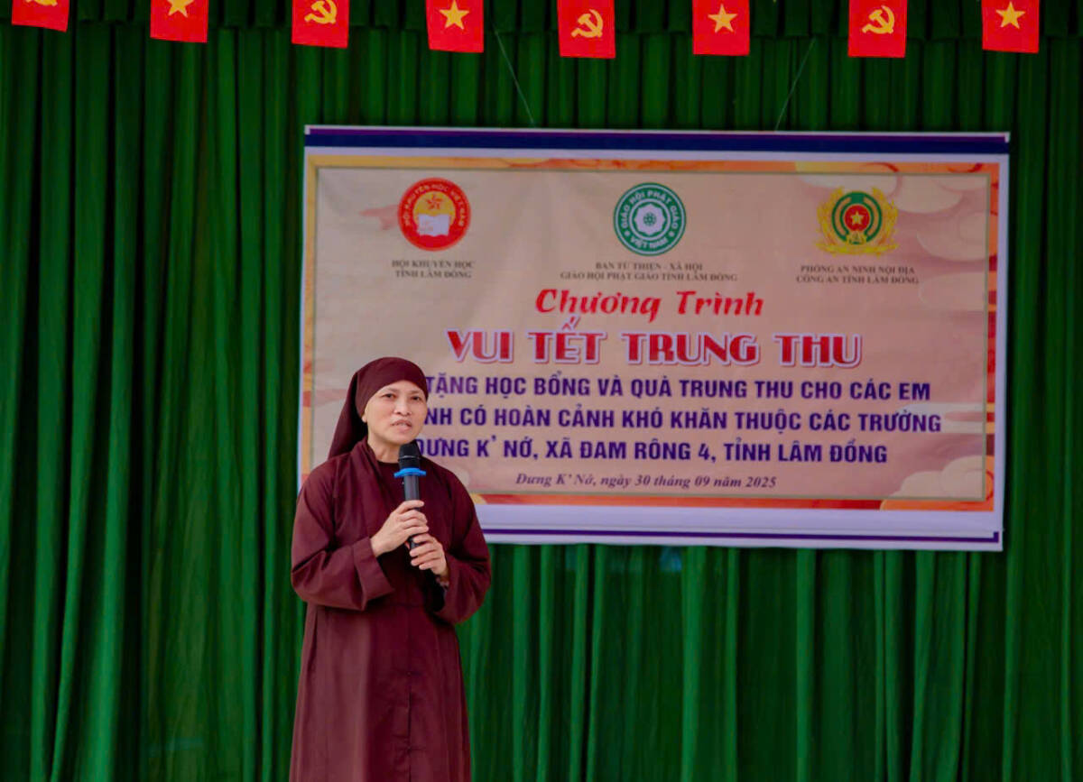 Thay mặt Ban TTXH Phật giáo, Ni sư Thích Nữ Hạnh Khai chúc các em học sinh đón mùa Trung thu 2025 tràn đầy niềm vui bên gia đình và bạn bè. Đồng thời, Ni sư cũng nhắn nhủ các em phải luôn hiếu thảo với cha mẹ, vâng lời thầy cô, hòa nhã với bạn học.