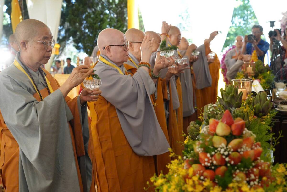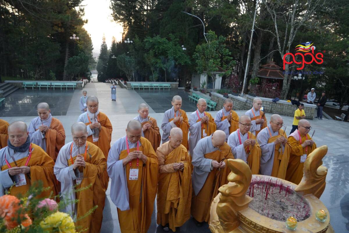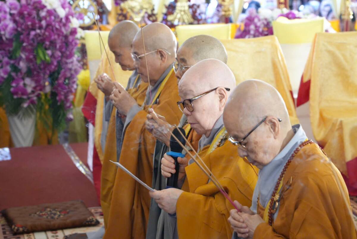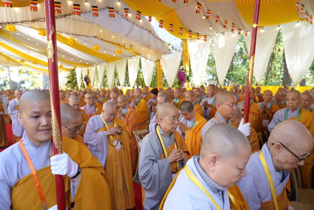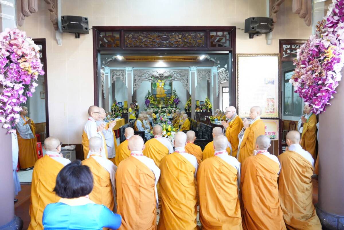 Giữa không gian trang nghiêm của đạo tràng, đại chúng đồng niệm danh hiệu Bổn Sư, cầu gia bị của mười phương chư Phật. Tiếng niệm Phật ngân dài trong sự nhất tâm thanh tịnh, như nhắc nhở mỗi hành giả trở về trong chánh niệm tỉnh thức, nhiếp tâm an trú trong pháp vị thanh lương.
