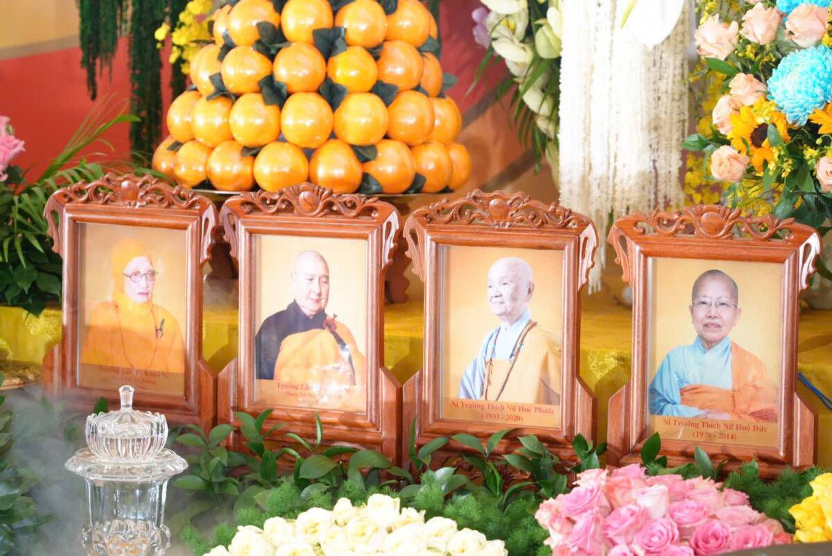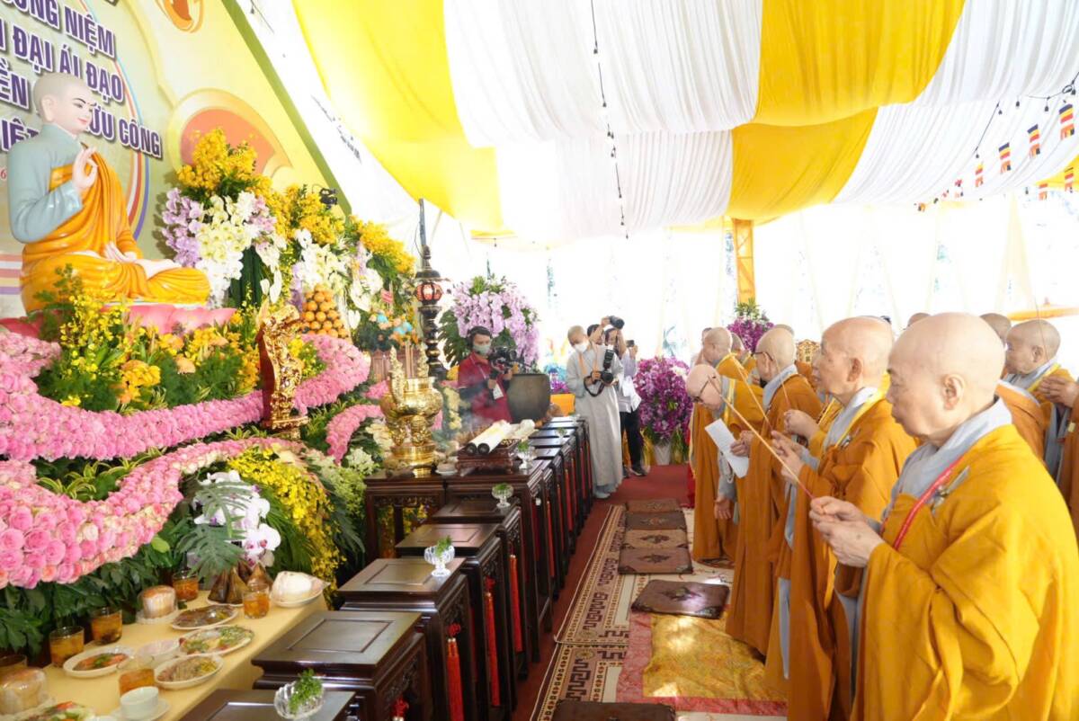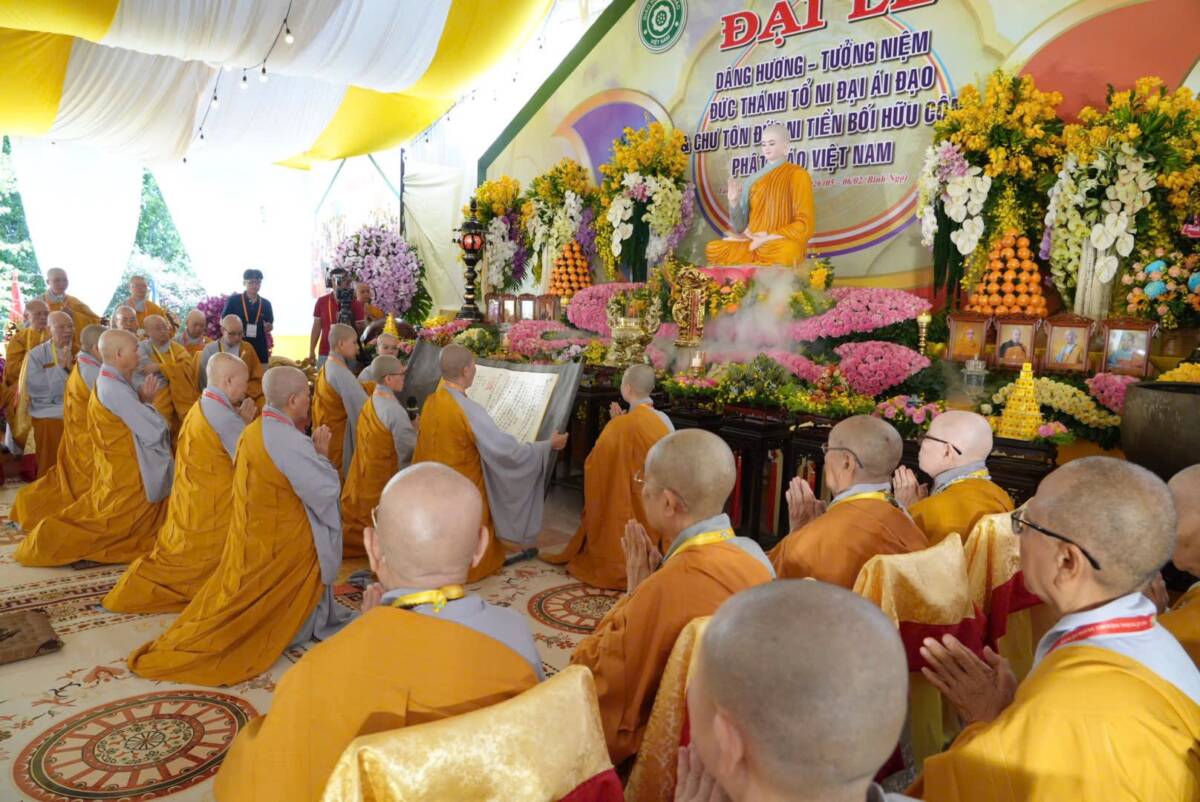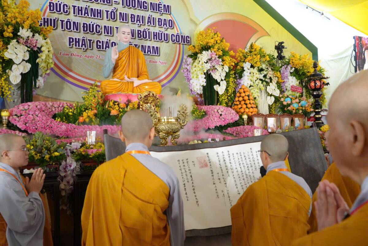 Trong giây phút lắng đọng, khi khói trầm nhẹ lan tỏa trước tôn dung Đức Thánh Tổ, toàn thể đại chúng đồng nhiếp tâm thanh tịnh, chí thành đảnh lễ Đức Thánh Tổ Ni Đại Ái Đạo – bậc đã mở rộng quảng đại giải thoát môn, khải phát Ni lưu trong giáo pháp của Như Lai; đồng thời tưởng niệm chư vị Tỳ-kheo Ni phàm thánh lịch đại Bắc truyền Nam hóa trong dòng truyền thừa Kiều Đàm Ni phái, cùng giác linh chư Tôn đức Ni tiền bối hữu công đã dày công dựng lập đạo tràng, truyền giáo, truyền giới, truyền đăng tục diệm, làm cho đạo mạch Ni đoàn được tiếp nối và sáng mãi đến hôm nay.