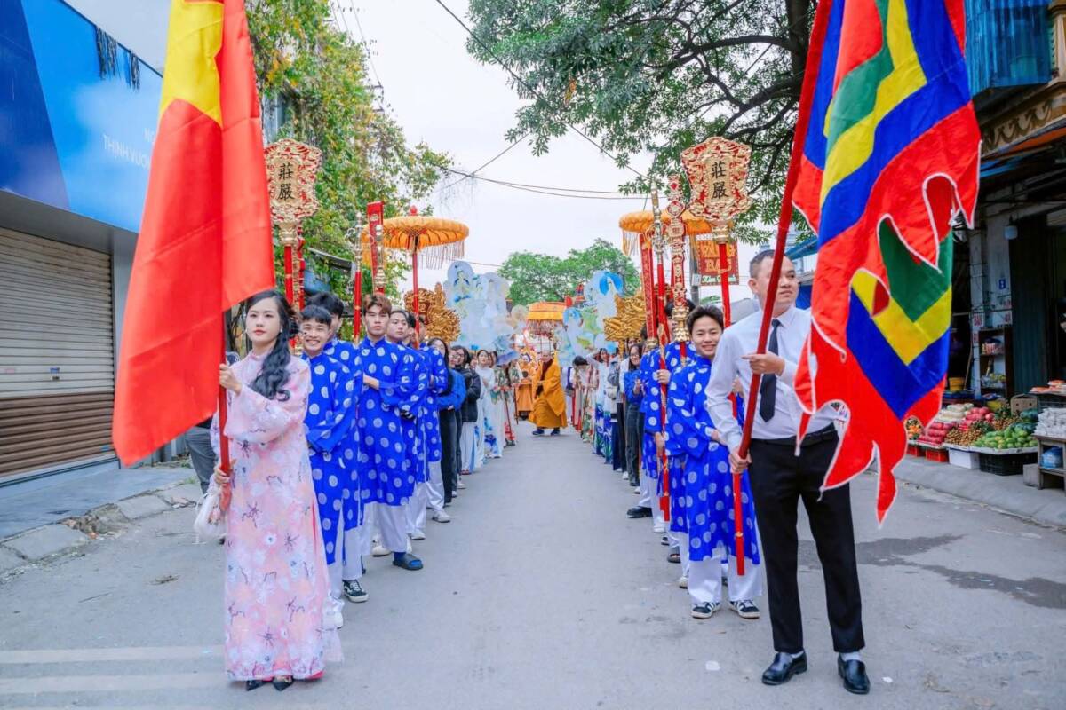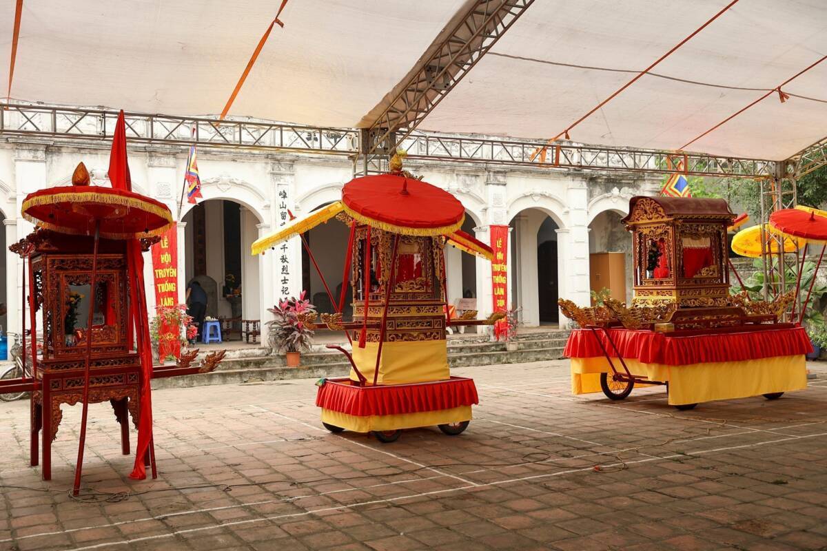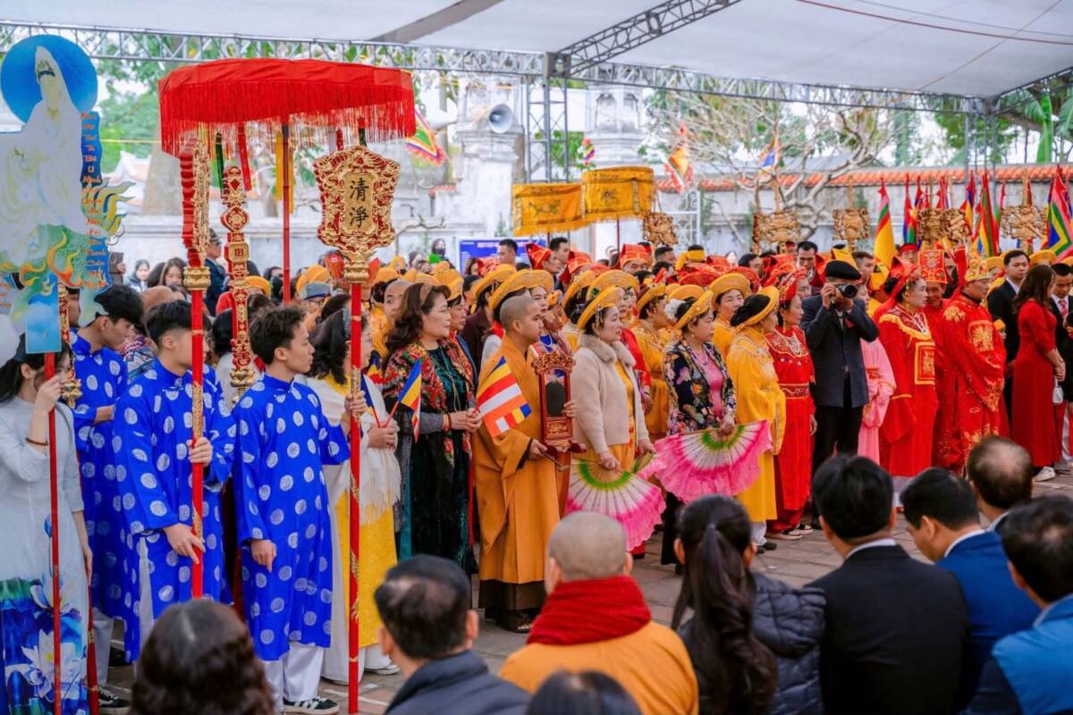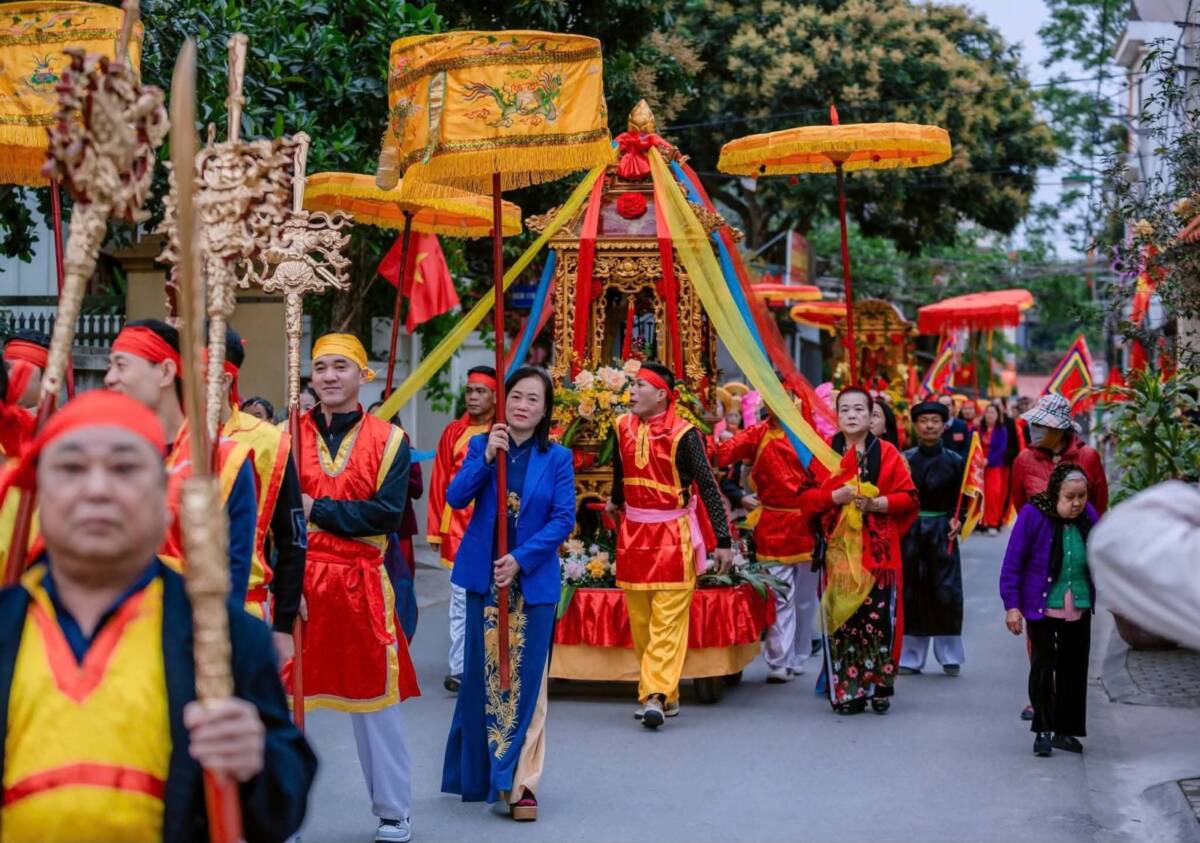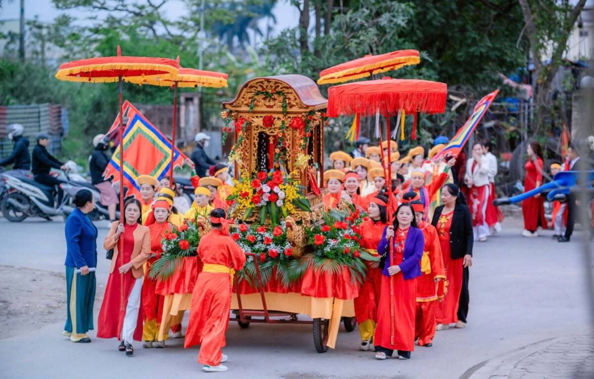 Điểm hội tụ cao nhất của lòng thành kính chính là ngày chính hội (3/3 âm lịch). Khi ánh nắng ban mai rải nhẹ trên những mái ngói rêu phong, đoàn rước kiệu long trọng bắt đầu khởi hành. Trong tiếng trống, tiếng chiêng rền vang, kiệu Quán Thế Âm Bồ Tát và Nguyên Phi Ỷ Lan du hành quanh làng như một sự lan tỏa phúc lành, che chở cho dân chúng.