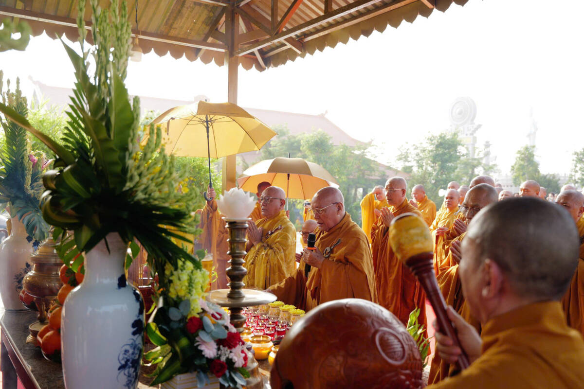 Sau khi dâng hương bạch Phật tác lễ cầu nguyện, chư tôn Hòa thượng, chư Tôn đức Tăng Ni cùng toàn thể đại chúng nhất tâm hòa điệu, tụng kinh cầu nguyện khởi dựng ngôi Đại hùng bảo điện và Tổ đường. Toàn thể đại chúng một lòng ngưỡng nguyện hồng ân Tam bảo, mười phương Như Lai Thế Tôn đồng lực gia trì; chư Bồ-tát, Hiền thánh Tăng, chư hộ giáo, hộ giới, hộ pháp gia bị, hộ trì cho Phật sự được thành tựu như nguyện.