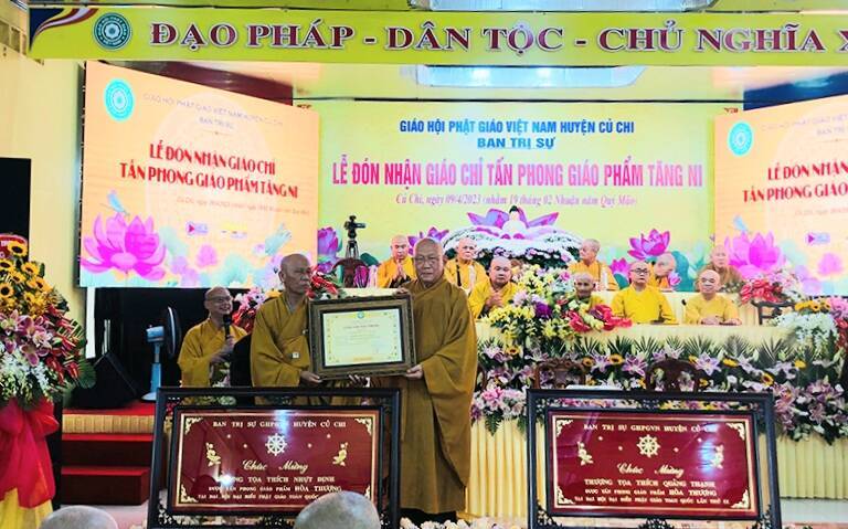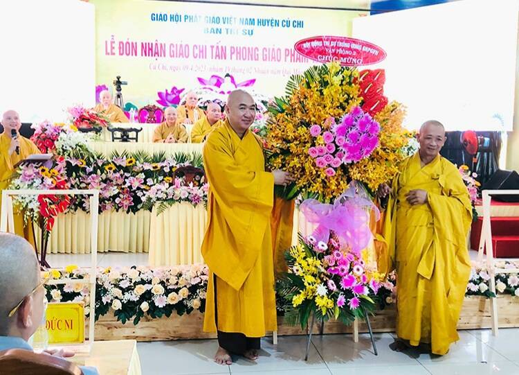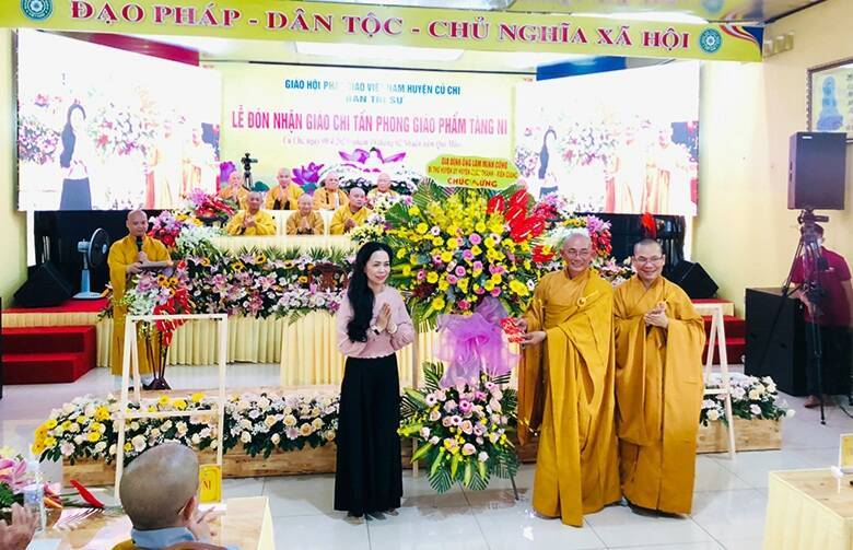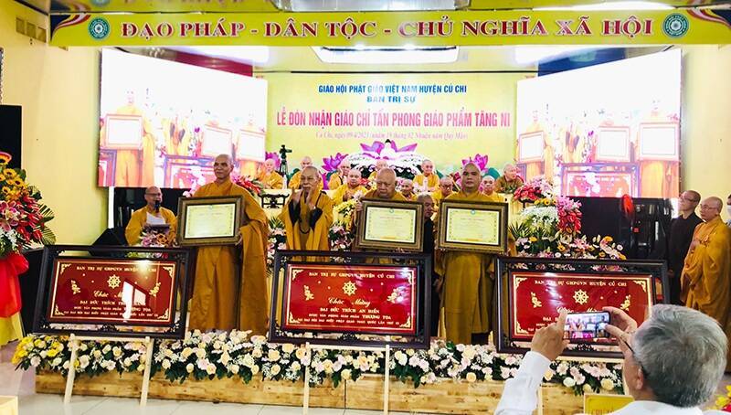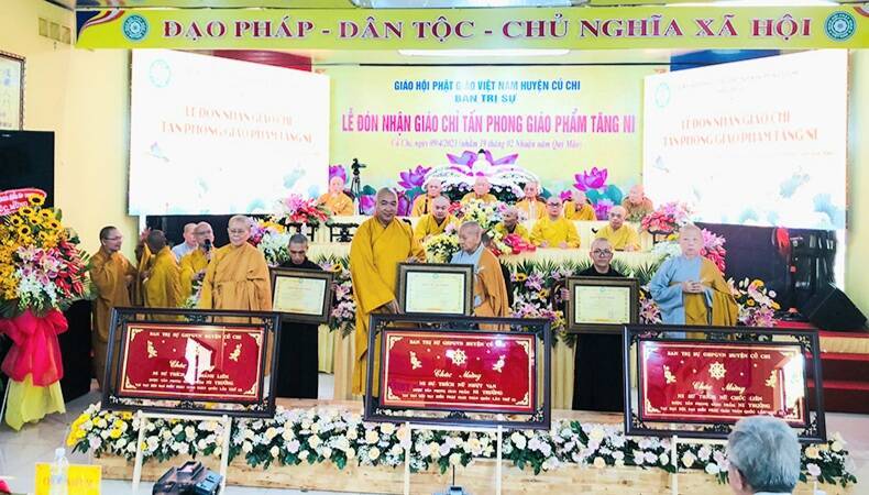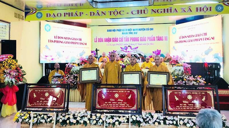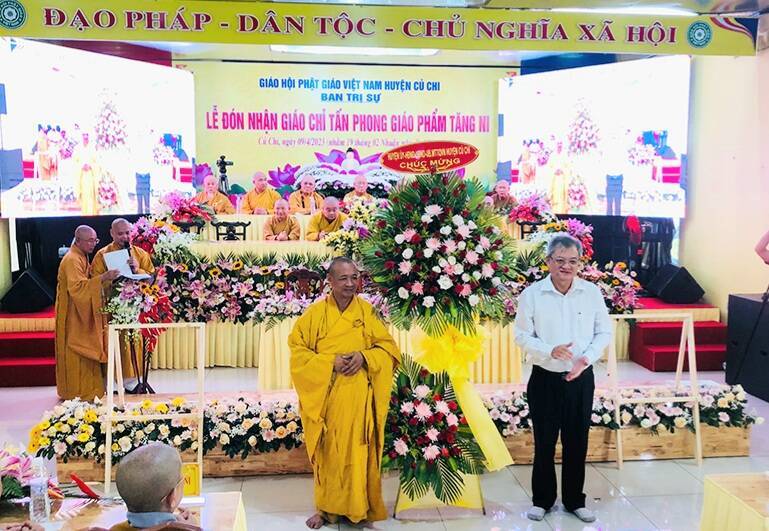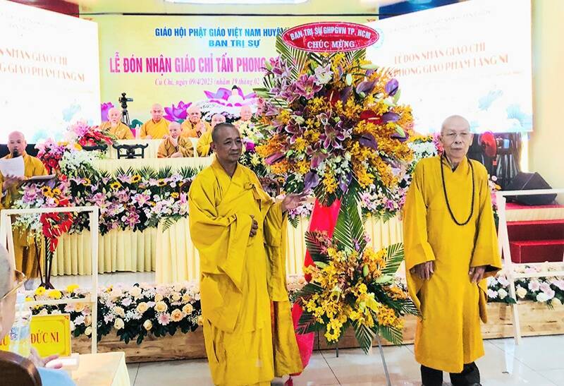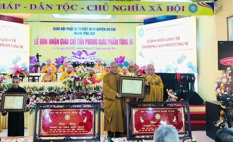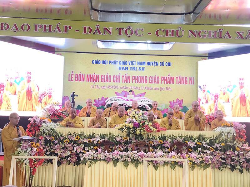Ngày 09 tháng 04 năm 2023 tại chùa Pháp Thành, xã Tân Thông Hội, huyện Củ Chi trọng thể tổ chức lễ trao Giáo chỉ tấn phong Giáo phẩm đến chư Tôn đức Tăng Ni trong huyện.