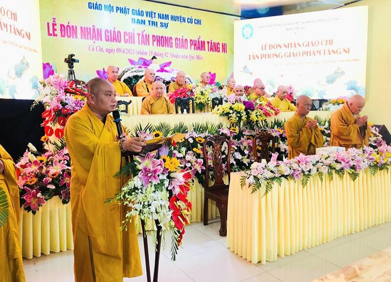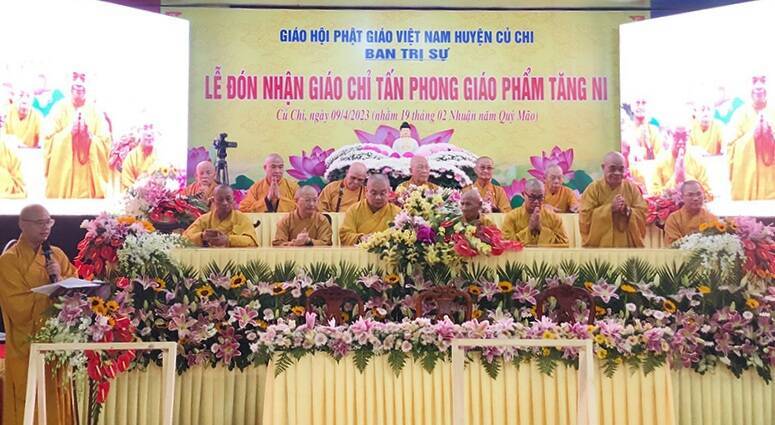Tiếp đó, TT. Thích Trung Nguyện- Ủy viên HĐTS GHPGVN, Phó thư ký kiêm chánh văn phòng BTS GHPGVN Tp. Hồ Chí Minh đã tuyên đọc quyết định tấn phong giáo phẩm cho 35 vị Chư tôn Đức Tăng- ni đơn vị Phật giáo huyện Củ Chi do HĐCM GHPG VN phê chuẩn. Đồng thời cung thỉnh HT. Thích Như Niệm trao giáo chỉ đến toàn thể chư Tôn đức Tăng Ni được tấn phong tại buổi lễ.