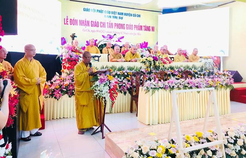 Giáo hội Phật giáo Việt Nam huyện Củ Chi đã gặt hái được nhiều thành quả thiết thực trên các mặt hoạt động Phật sự của Giáo hội. Tất cả thành tựu đó là nhờ sự chỉ đạo của Ban Thường trực Hội đồng Trị sự, sự quan tâm tạo điều kiện giúp đỡ của các cơ quan ban ngành các cấp, sự đoàn kết một lòng, đồng tâm hiệp lực của tập thể Ban Trị sự và toàn thể Tăng Ni, Phật tử Phật giáo huyện. Những thành tựu ấy thể hiện rõ nét qua Phật sự thiết thực trong thời gian qua, được tuyên dương tại Đại hội Phật giáo huyện, đóng góp một phần công sức phát triển ngôi nhà chung Giáo hội Phật giáo Việt Nam. Ban Trị sự mong rằng, chư Tôn đức được tấn phong giáo phẩm tiếp tục đóng góp công sức của cho công tác Phật sự của Giáo hội, dù ở cương vị nào, chư Tôn đức là đại diện cho Giáo hội tại các cơ sở, truyền tải thông điệp hoằng pháp lợi sanh, thực hiện những lời Phật dạy đến với đồng bào Phật tử gần xa để không phụ sự tin tưởng giao phó của chư Tôn đức lãnh đạo Giáo hội.”