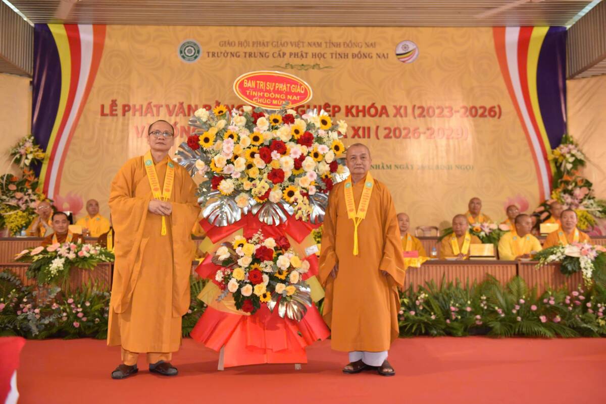 Mở đầu buổi lễ, Thượng tọa Hiệu trưởng phát biểu khai mạc: “Trường Trung cấp Phật học Đồng Nai, nguyên là Trường Cơ bản Phật học tỉnh Đồng Nai, được thành lập từ năm 1990, đến nay đã đào tạo được 11 khóa học, tổng số Tăng Ni sinh tốt nghiệp là 2.294 vị. Ngày hôm nay, đối với Tăng Ni sinh Khóa XI là dấu mốc quan trọng, ghi nhận những thành tựu nhất định qua 03 năm chuyên cần tu học và rèn luyện. Tấm văn bằng hôm nay không chỉ là ghi nhận kết quả của tri thức đã tích lũy, mà còn là minh chứng cho sự trưởng thành về đạo tâm, giới hạnh và sự quyết tâm tiến tới trên con đường tu tập. Tuy nhiên, đây không phải là điểm kết thúc, mà chính là sự khởi đầu cho một hành trình rộng lớn hơn – hành trình tiếp tục tu học ở cấp bậc cao hơn đồng thời đem giáo pháp vào đời, hoằng pháp lợi sanh.”
