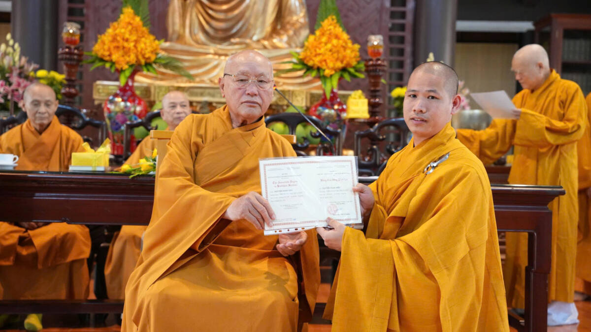 Đại diện Tăng Ni sinh, Thiền sinh Thích Đạt Ma Hạnh Tuệ dâng lời tác bạch: “Chúng con có duyên lành gặp Phật pháp, được xuất gia nơi pháp hội của Hòa thượng Trúc Lâm, đặc biệt là được chư tôn đức hun đúc giũa rèn từ thuở nhỏ. Sau quá trình tu học tại các Đạo tràng theo sự sắp đặt của quý ngài, chúng con lại được phước duyên học tập chuyên sâu nơi lớp Cao đẳng Trường thiền Liên thông. Đây chính là niềm vui, niềm hạnh phúc trong cuộc đời tu hành của chúng con. Xin tri ân tất cả tấm lòng thành trên từ Tam bảo, Thầy Tổ đến chư vị Giáo Thọ sư, đàn-na tín chủ ủng hộ trong suốt chặng đường qua…”