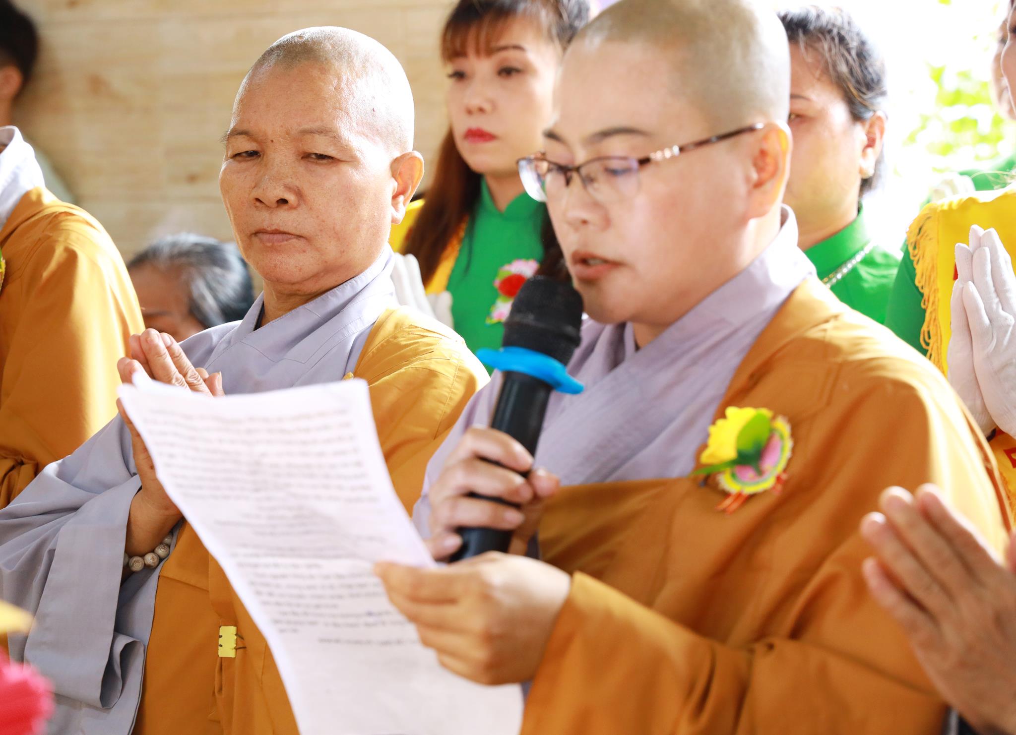 Đại diện Chư Tăng ni và Phật tử chùa Linh Nguyên, SC. TN. Diệu Thảo dâng lời tác bạch tưởng nhớ tứ ân, trong đó đã nhắc đến ơn sinh thành dưỡng dục của cha mẹ, ơn nuôi dưỡng giới thân huệ mạng của Thầy Tổ, bùi ngùi xúc động khi nhớ về những kỷ niệm của Hòa thượng Tôn sư lúc sinh tiền.