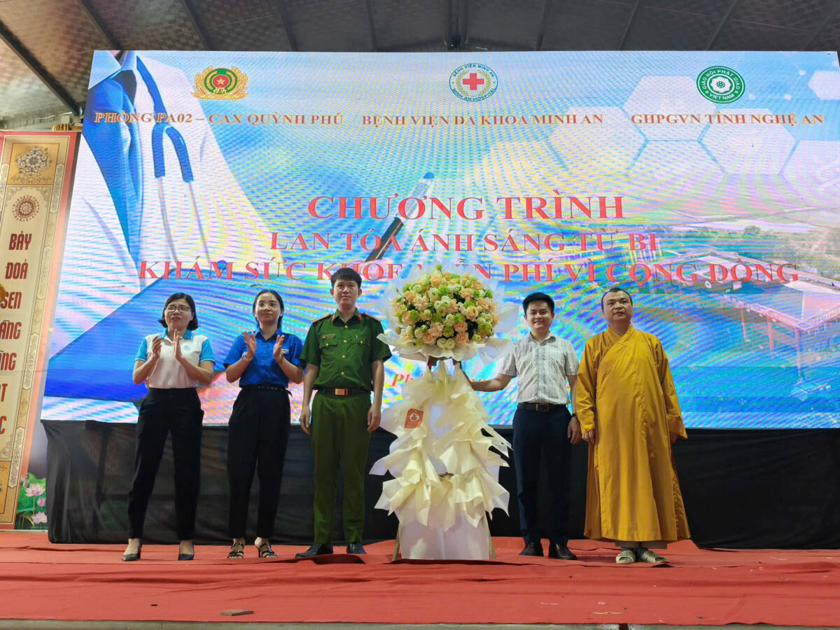 Đại biểu khách quý có Ông Hồ Sỹ Nguyệt, Phó Trưởng Ban Tổ chức Tỉnh ủy Nghệ An; Bà Tô Thị Tâm – Phó Chủ tịch UBMTTQ, Chủ tịch Hội Phụ nữ xã Quỳnh Phú; Chị Trần Hải Yến – Phó Chủ tịch UBMTTQ, Bí thư Đoàn Thanh niên xã Quỳnh Phú; Trung tá Nguyễn Tiến Lượng – Chính trị viên phó Đồn Biên phòng 148; Thiếu tá Trần Xuân Phương – Phó Trưởng Công an xã Quỳnh Phú; Bác sĩ Đậu Vi Sơn – Trưởng Phòng Kinh doanh Bệnh viện Đa khoa Minh An; cùng Lãnh đạo, Cán bộ chiến sĩ Đồn Biên phòng Quỳnh Thuận, Công an xã Quỳnh Phú và Bệnh viện Đa khoa Minh An. Chương trình đặc biệt này, thu hút sự tham dự của gần 600 Phật tử, Đoàn viên Thanh niên, Hội viên Phụ nữ và bà con nhân dân tham dự.