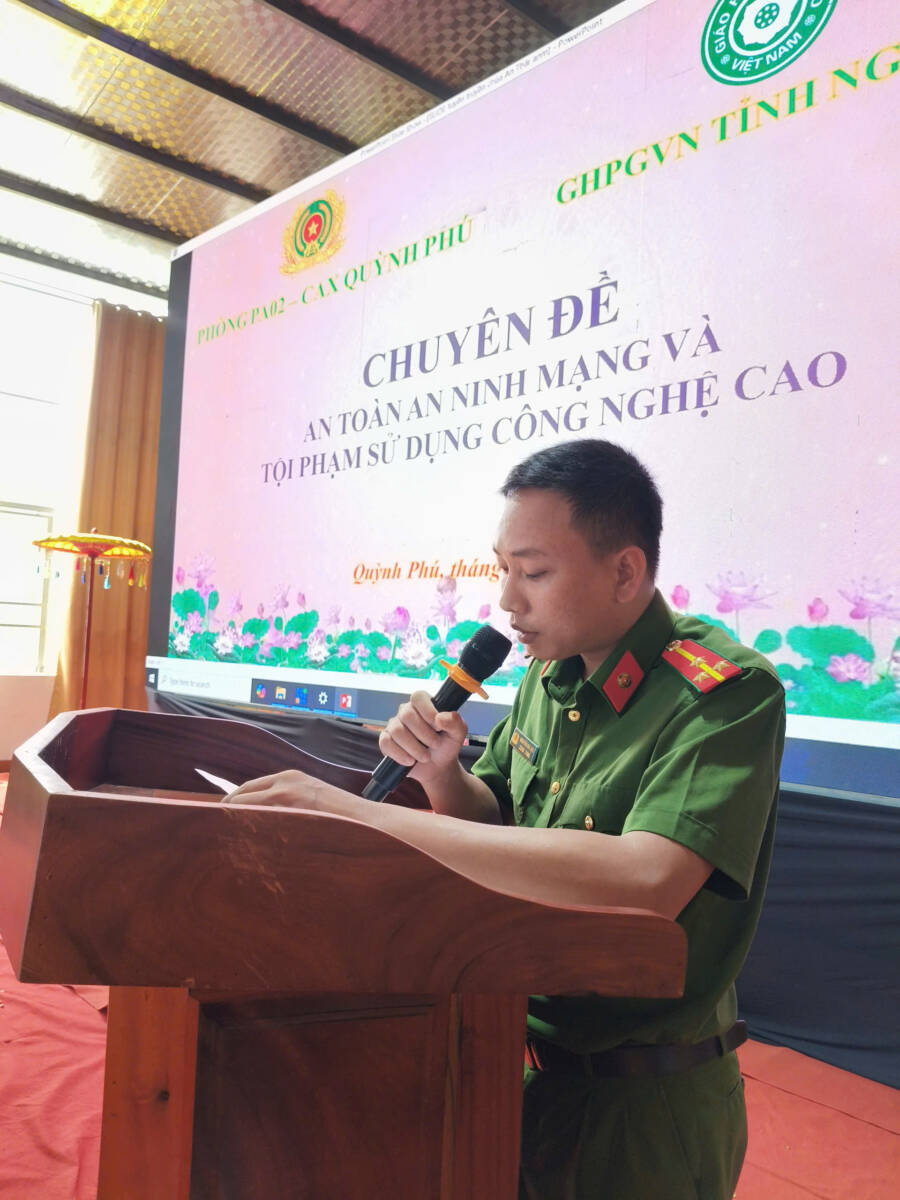 Tiếp đến, Hội nghị được lắng nghe Thượng úy Nguyễn Bá Lộc chia sẻ chuyên đề: “An toàn an ninh mạng và tội phạm sử dụng công nghệ cao”. Trong bối cảnh, nhiều loại hình tội phạm lừa đảo với chiêu trò khác nhau, gây mất an ninh cơ sở, tiềm ẩn nhiều phức tạp. Chúng ta cần nâng cao cảnh giác và kỹ năng, phòng chống tội phạm sử dụng công nghệ cao, góp phần đảm bảo an ninh chính trị, trật tự an toàn xã hội.